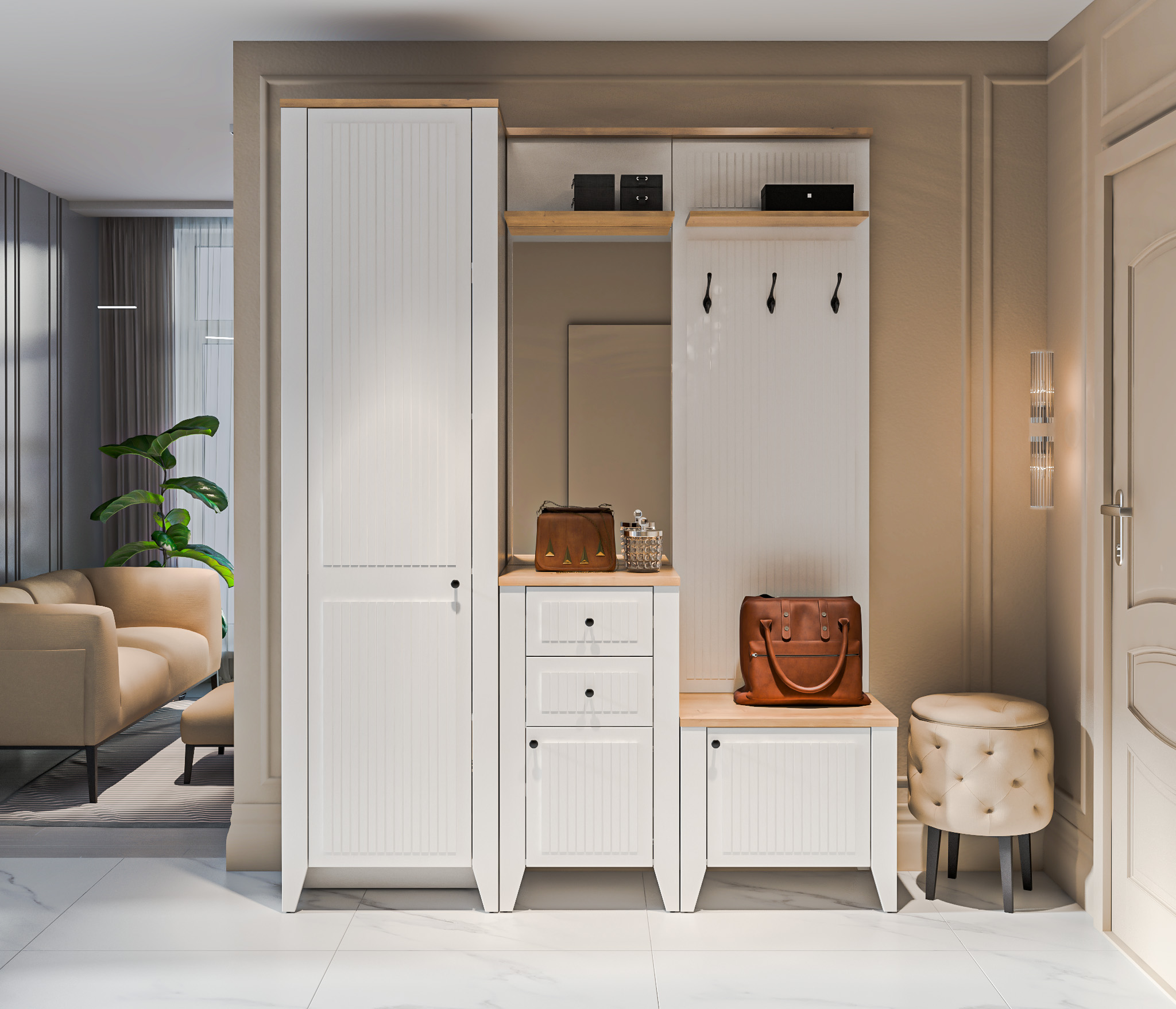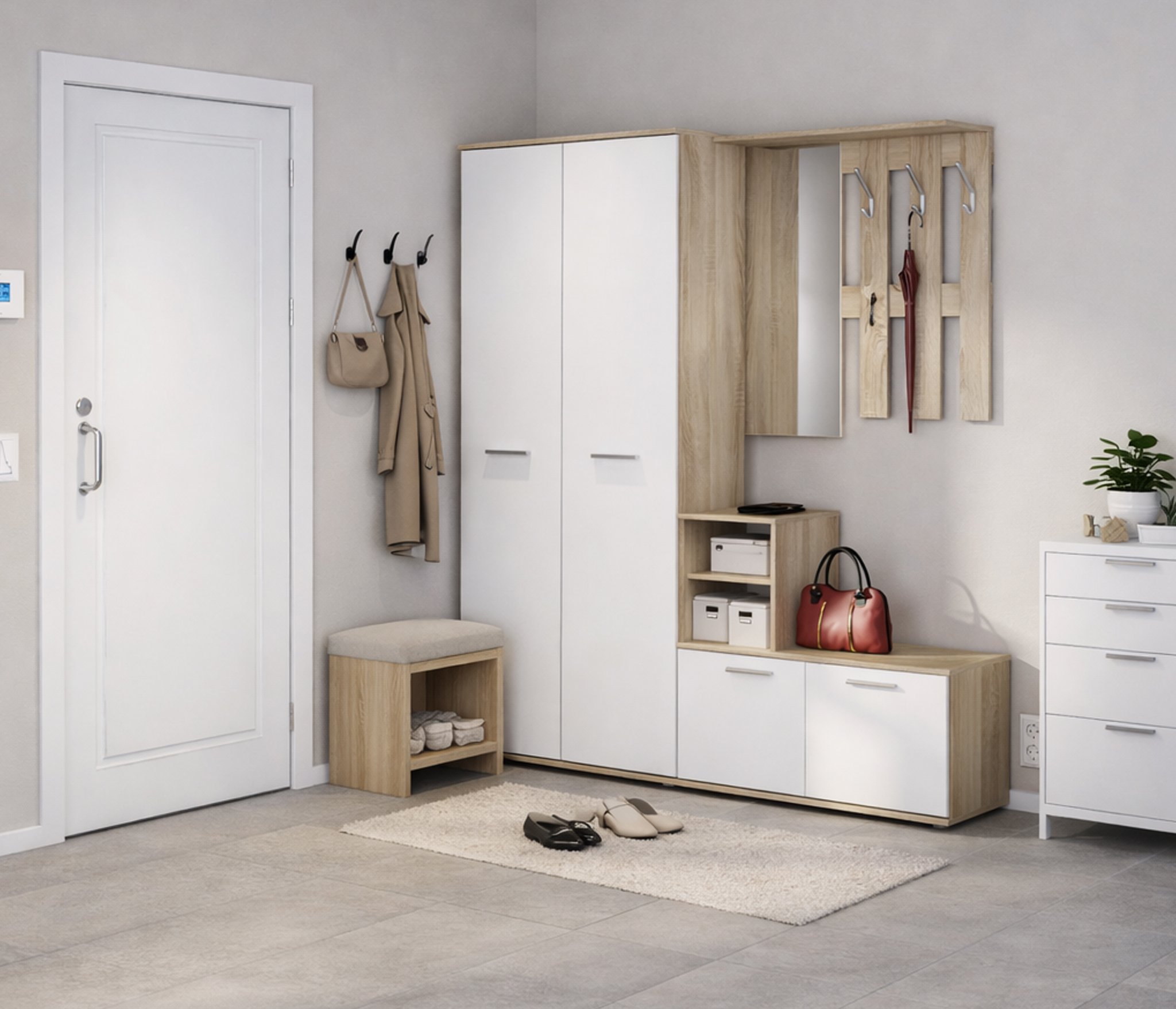 Комоды, вешалки, обувницы, зеркала, полки, антресоли, выполненные в едином стиле, эргономично разместятся независимо от площади и характеристик помещения.