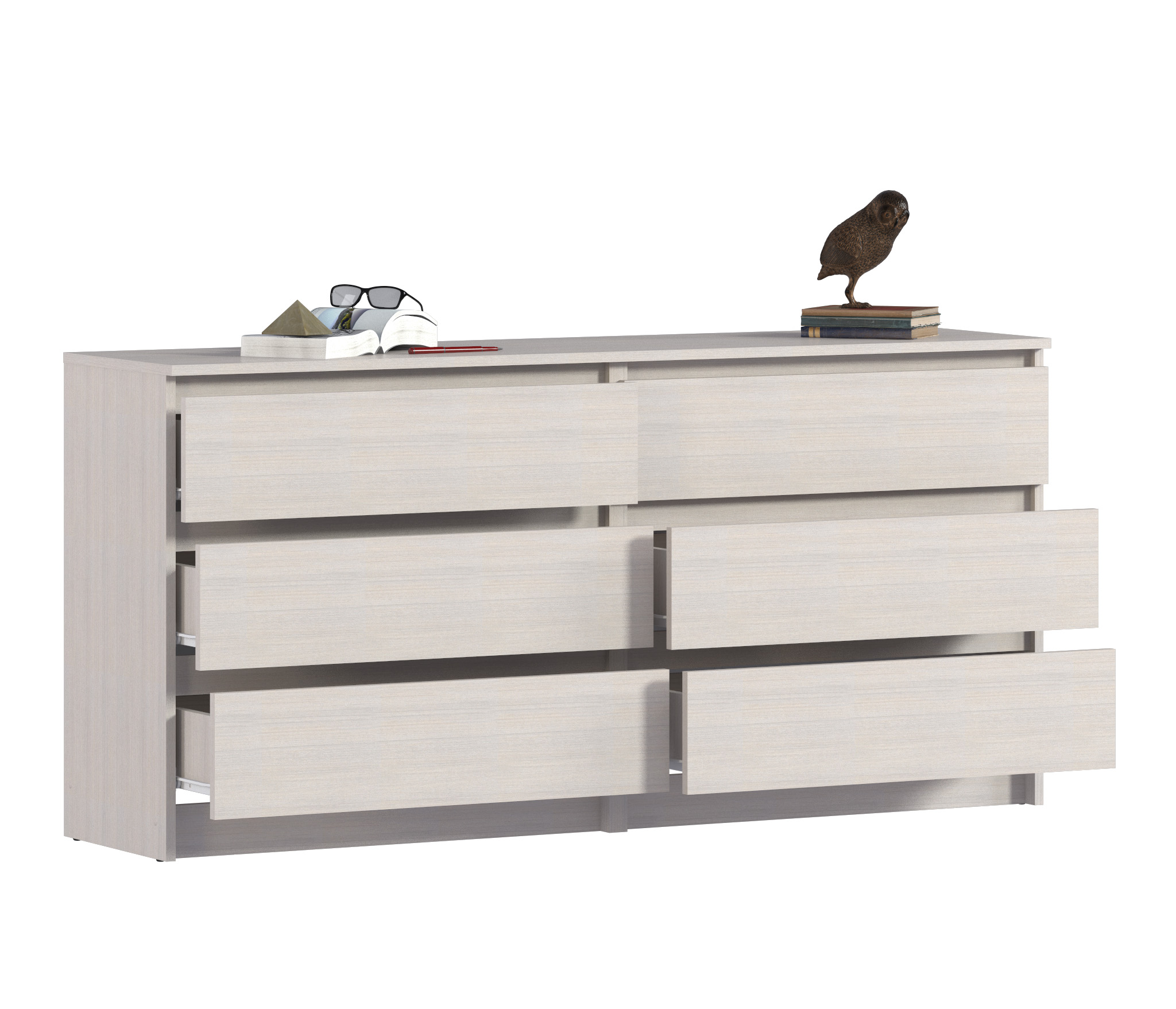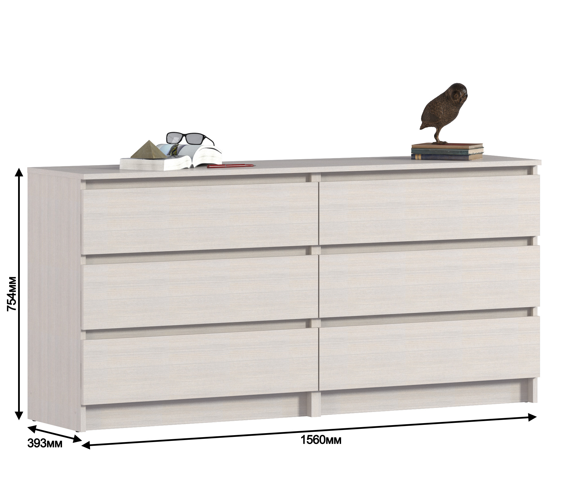 Комод с ящиками выполнен из ЛДСП: прочного и долговечного материала, который устойчив к механическим повреждениям. Мебель дополнена шестью вместительными ящиками, надежными механизмами открывания, а отсутствующие ручки делают модель более органичной и лаконичной.