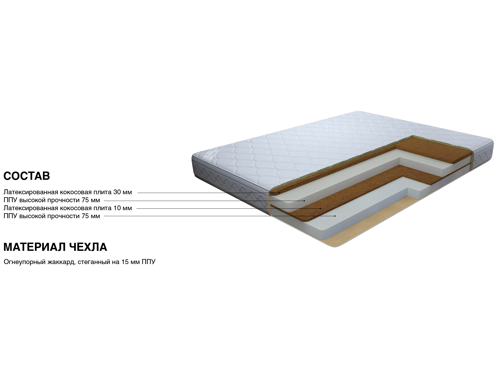 Наполнитель: Латексированные листы кокосовой койры 30 и 10 мм, 2 листа ППУ 750 мм