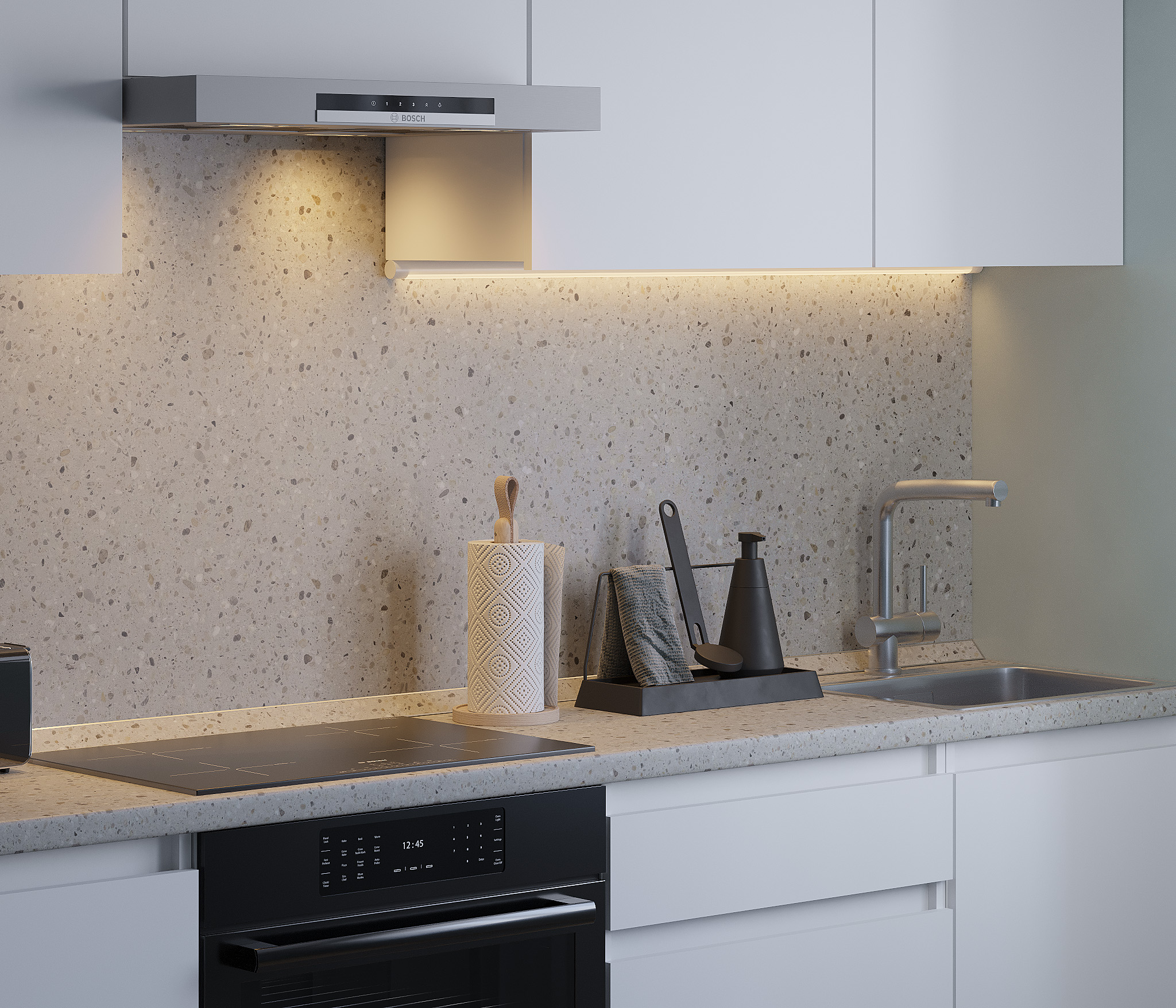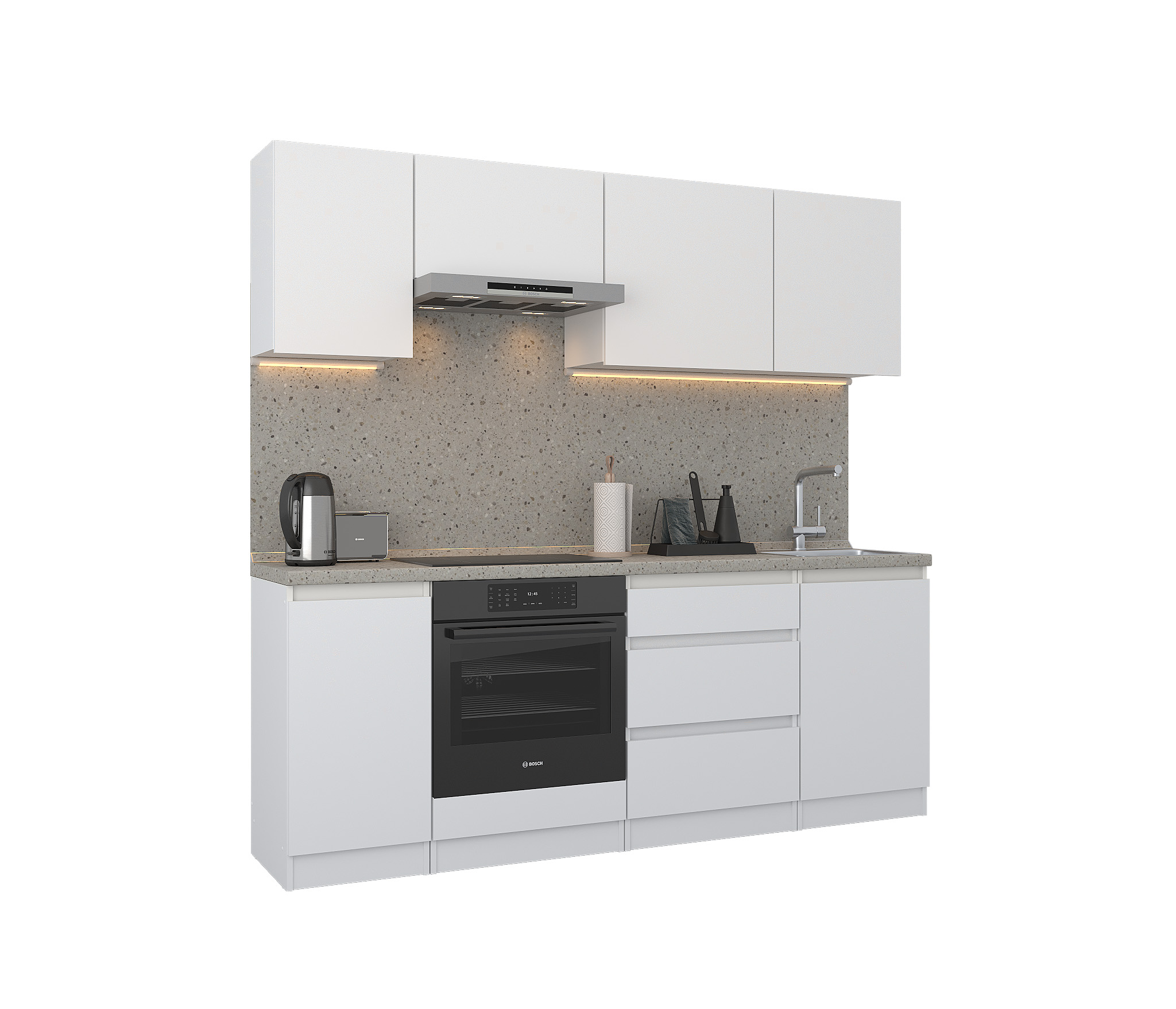 Кухня Леон сочетает в себе функциональность, стиль и доступность, и является прекрасным выбором для тех, кто ищет компактное и удобное решение для своей кухни. Кухонный гарнитур Леон идеально подходит для помещений с ограниченным пространством. Корпус и фасады выполнены из белого ЛДСП. Фасады столов и шкафов не имеют лицевой фурнитуры и открываются захватом за тыльный край фасада. Леон смотрится современно, а отсутствие ручек упрощает уход за поверхностью.