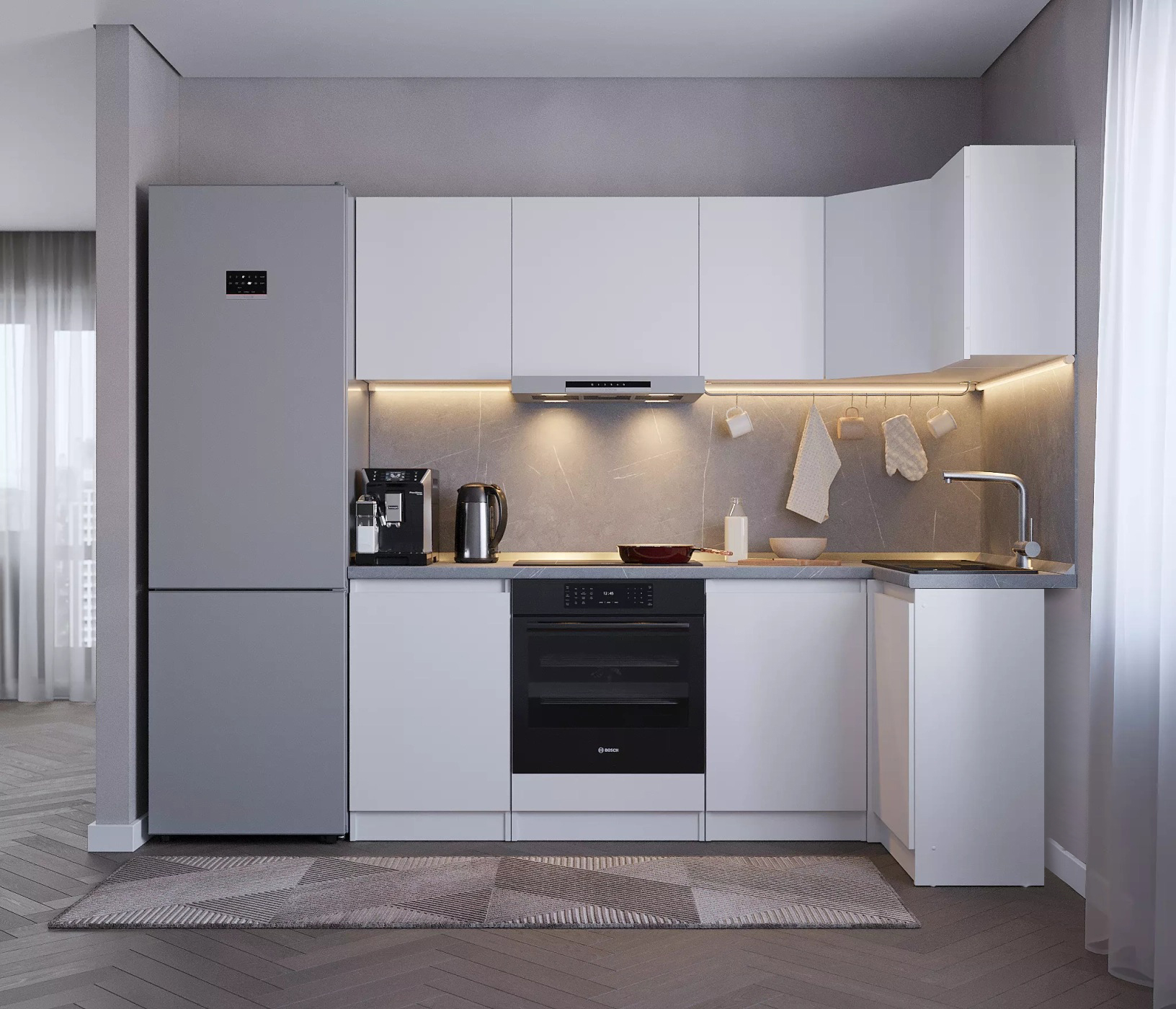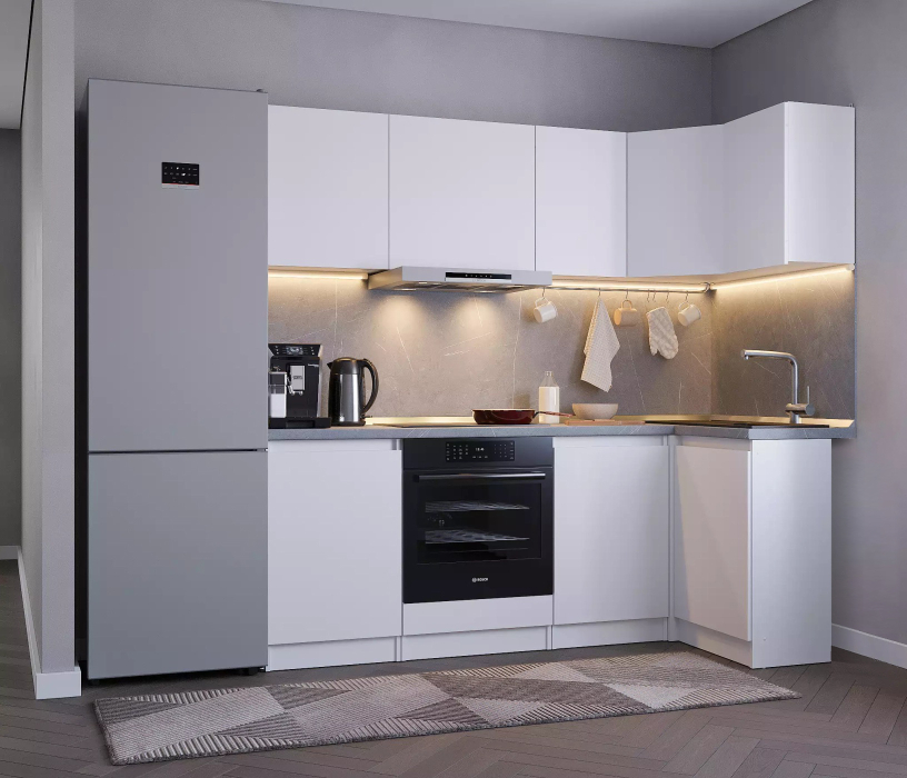 Кухня Леон сочетает в себе функциональность, стиль и доступность, и является прекрасным выбором для тех, кто ищет компактное и удобное решение для своей кухни. Кухонный гарнитур Леон идеально подходит для помещений с ограниченным пространством. Корпус и фасады выполнены из белого ЛДСП. Фасады столов и шкафов не имеют лицевой фурнитуры и открываются захватом за тыльный край фасада. Леон смотрится современно, а отсутствие ручек упрощает уход за поверхностью.