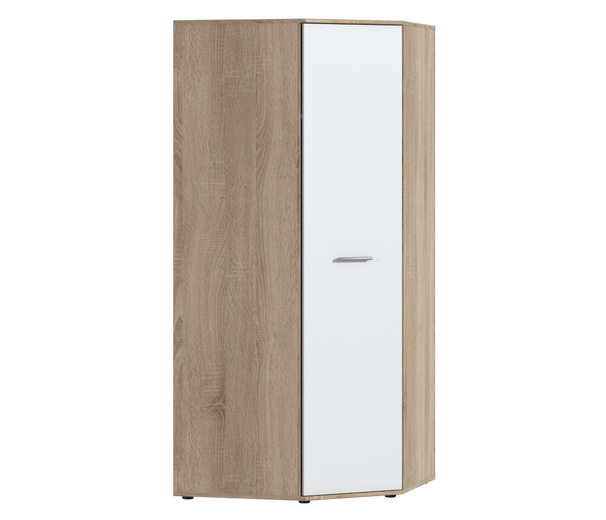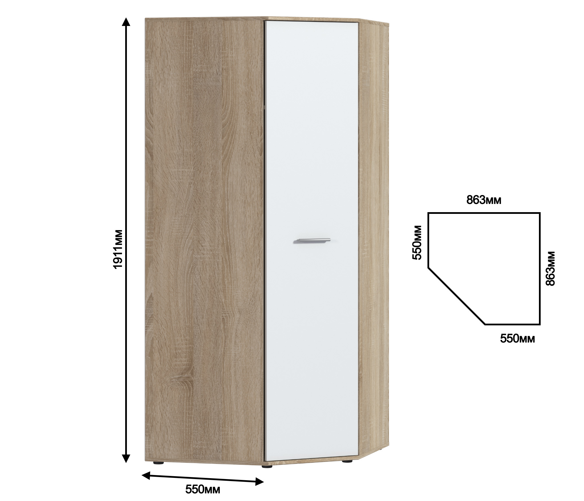 Габариты углового шкафа Мамбо СБ-2678 – ширина 86 см, высота 191 см и глубина 86 см. Это одно вместительное отделение со штангой для верхней одежды с антресолью сверху. Выполнен шкаф из прочного и современного материала КДСП. Цвет отделки корпуса – «Дуб Сонома», а фасадные поверхности белого цвета. Благодаря светлым тонам, шкаф не выглядит громоздким.
