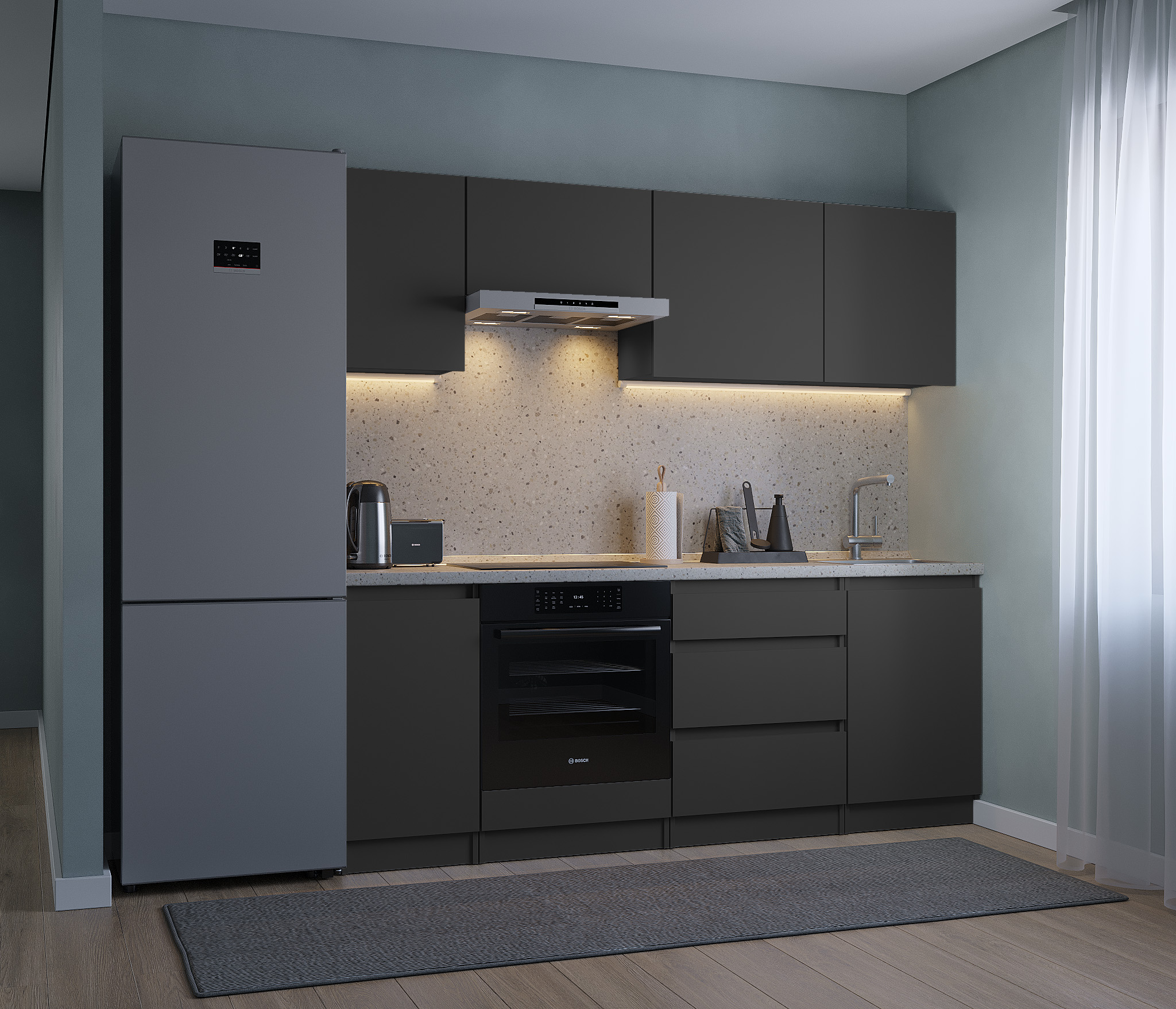Обратите внимание, что столешница, стеновая панель, мойка и смеситель не входят в комплектацию кухни Леон и приобретаются отдельно. Это позволяет вам выбрать идеальные аксессуары и элементы для создания индивидуального дизайна вашей кухни.