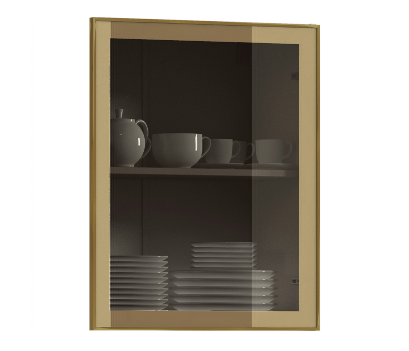 Фасад кухни выполнен из алюминиевой рамки золотого цвета, которая придаёт интерьеру элегантность и современный стиль. Бронзовое стекло добавляет нотку роскоши и глубины, создавая эффектный контраст с рамкой.