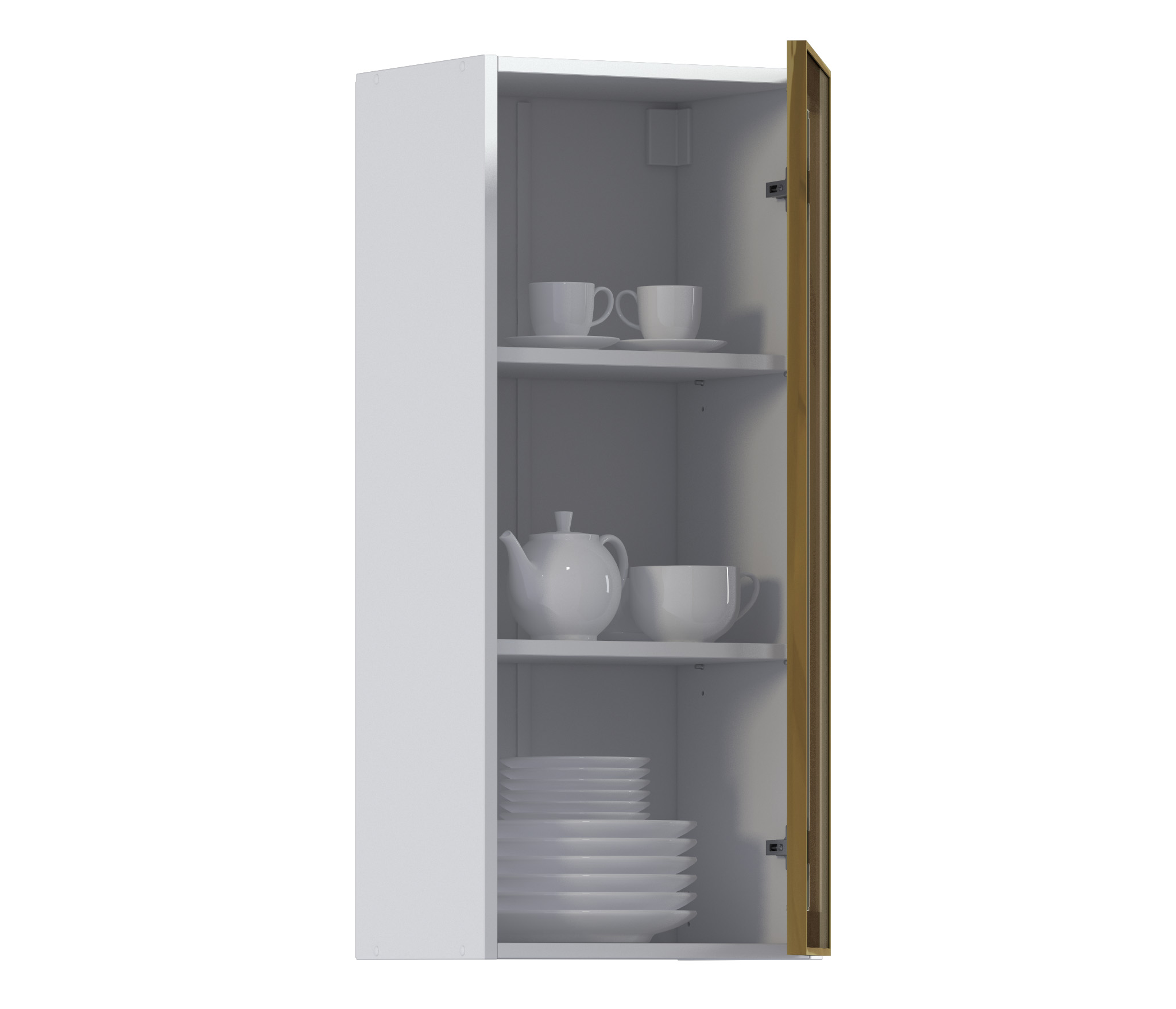 Комплект включает в себя корпус кухонной полки (белого цвета) с необходимой фурнитурой, фасад из алюминиевой рамки золотого цвета и бронзового стекла, а также ручку, соответствующую цвету рамки фасада.