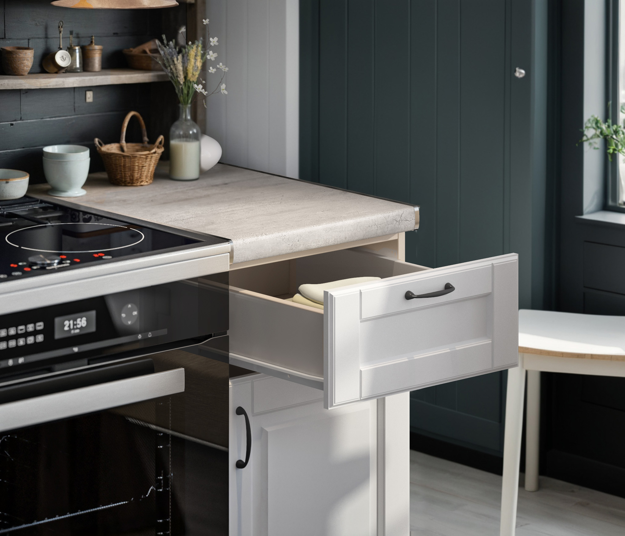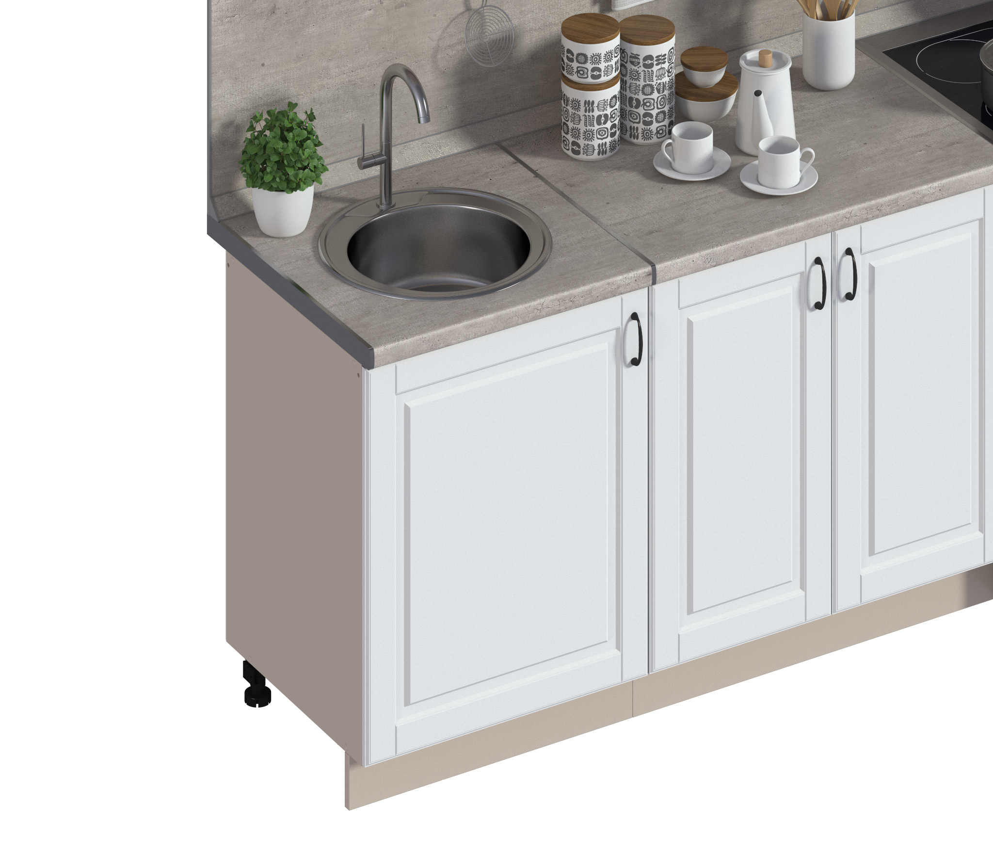 – Каждый напольный модуль комплектуется индивидуальной столешницей и цоколем, соответствующими размерам шкафа.