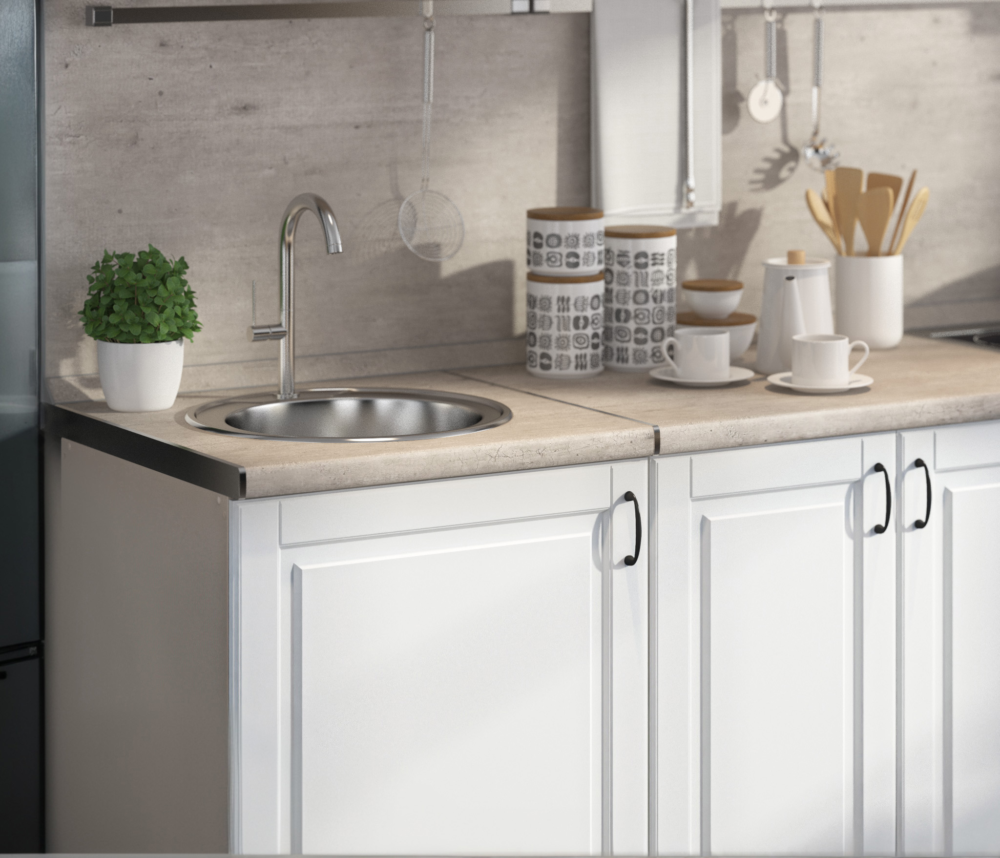 – Столешница для модуля с мойкой уже имеет вырез, подходящий под конкретную модель мойки (размеры мойки: диаметр — 50 см, чаша — 37 см, глубина — 16 см).