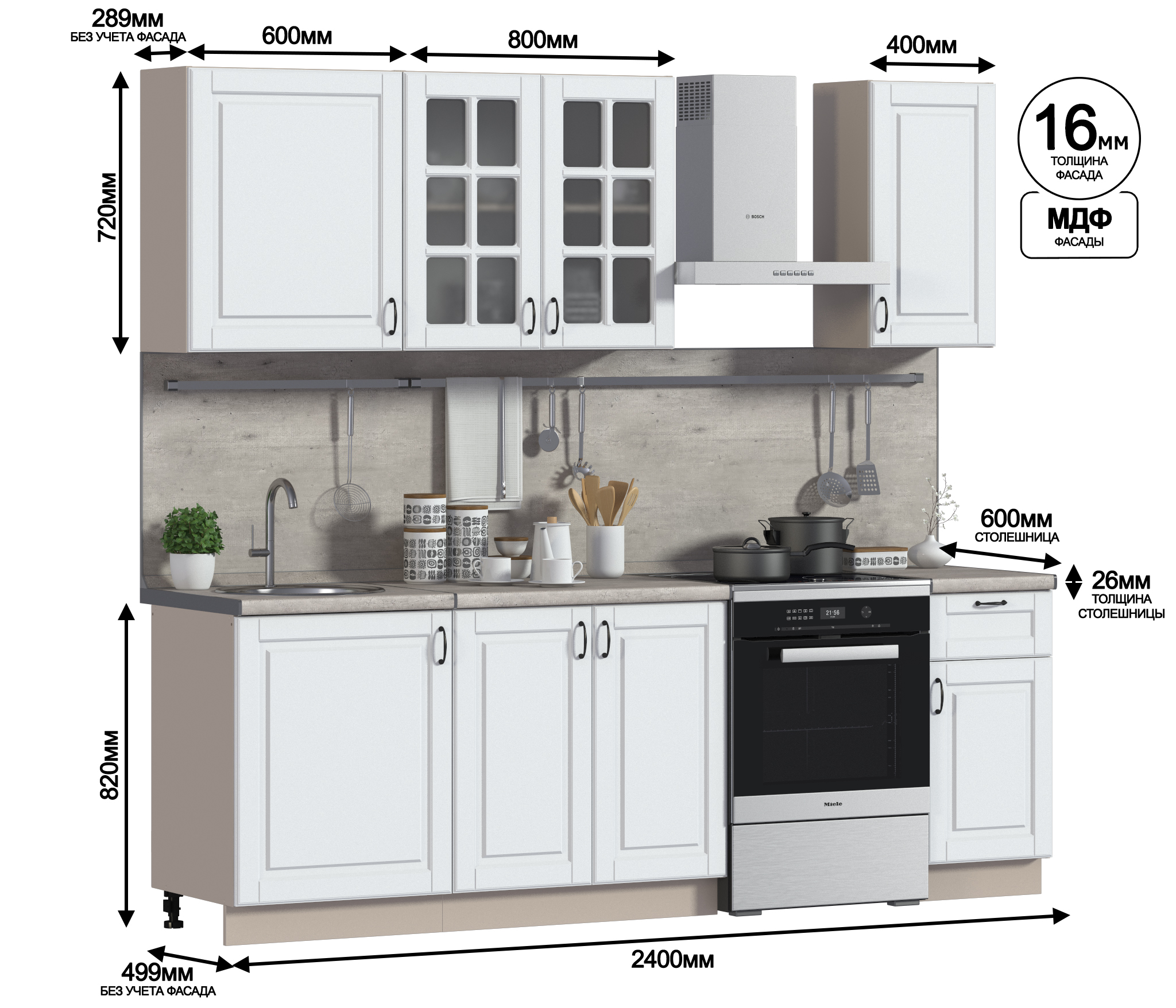 Размер кухонного гарнитура (со стандартной плитой 600 мм) - 2400 мм.