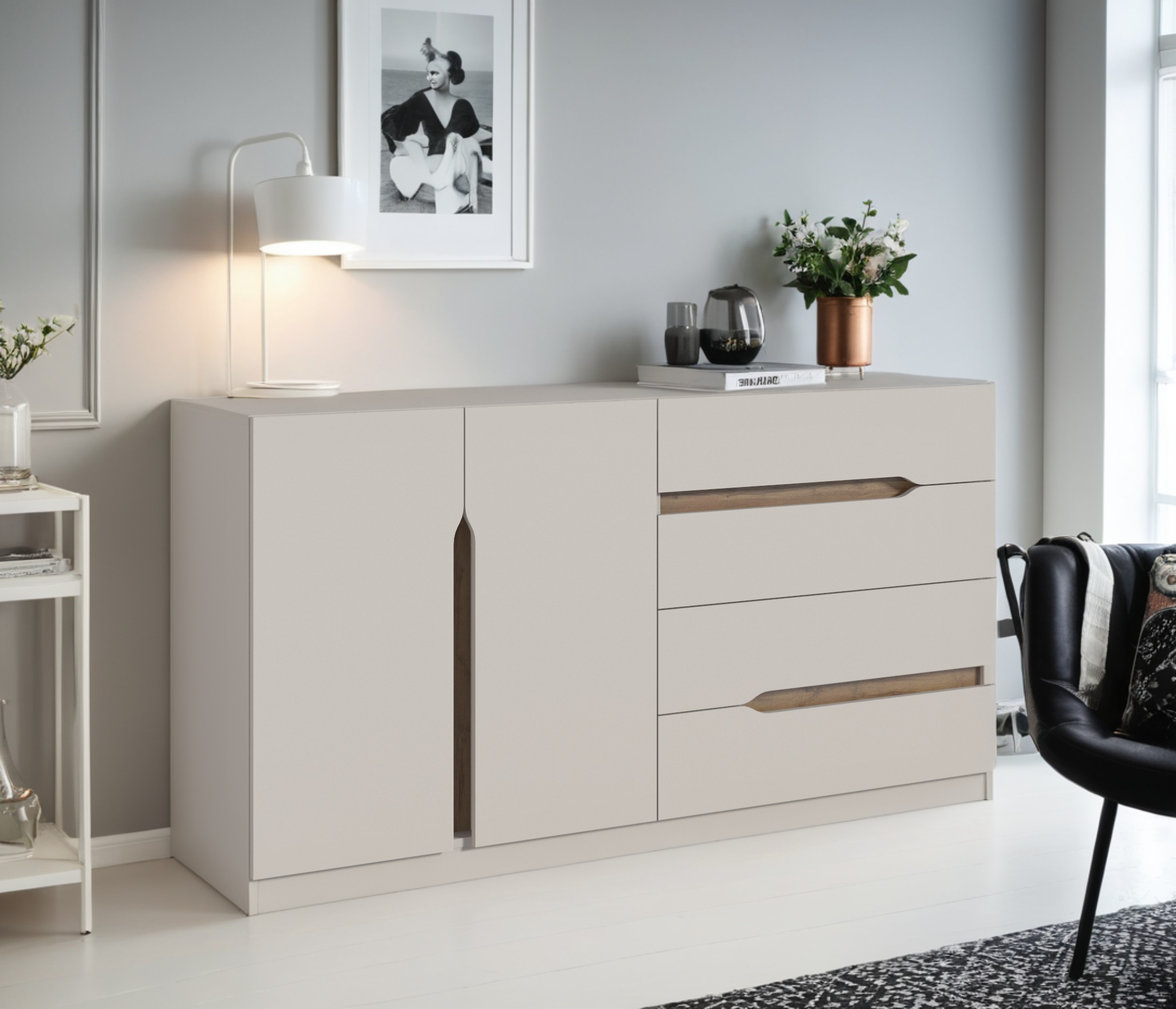 Особенностью данной модели являются плавные вырезы в фасадах, которые не только удобны для открывания, но и добавляют оригинальности. Внутри этих вырезов расположены вставки цвета Дуб вотан, что создает контраст и подчеркивает эстетику мебели.