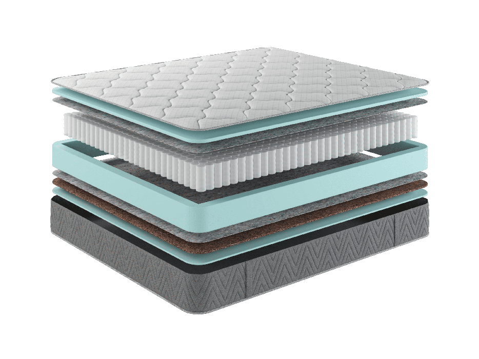 Чехол из белого трикотажа, стеганого на объемном волокне 200 гр/м2. Боковина: трикотаж серый, стеганый. Пена, 20мм. Термовойлок. Независимый пружинный блок, 140мм. Термовойлок. Бикокос 10мм. Пена 10мм. Усиление по периметру матраса 100мм. Высота 21см. Нагрузка 120кг