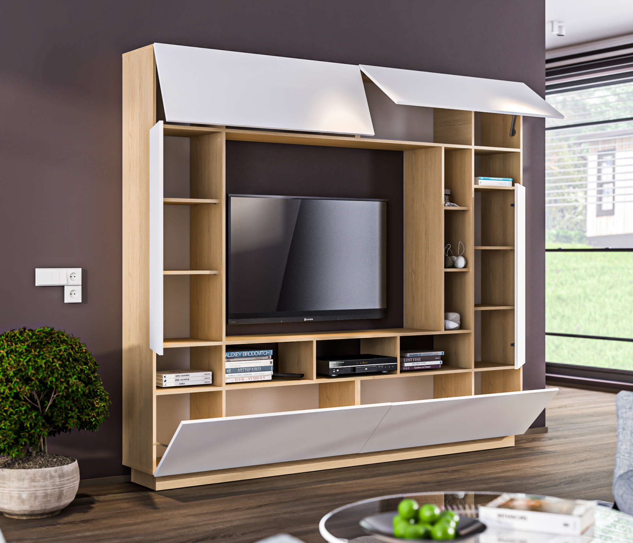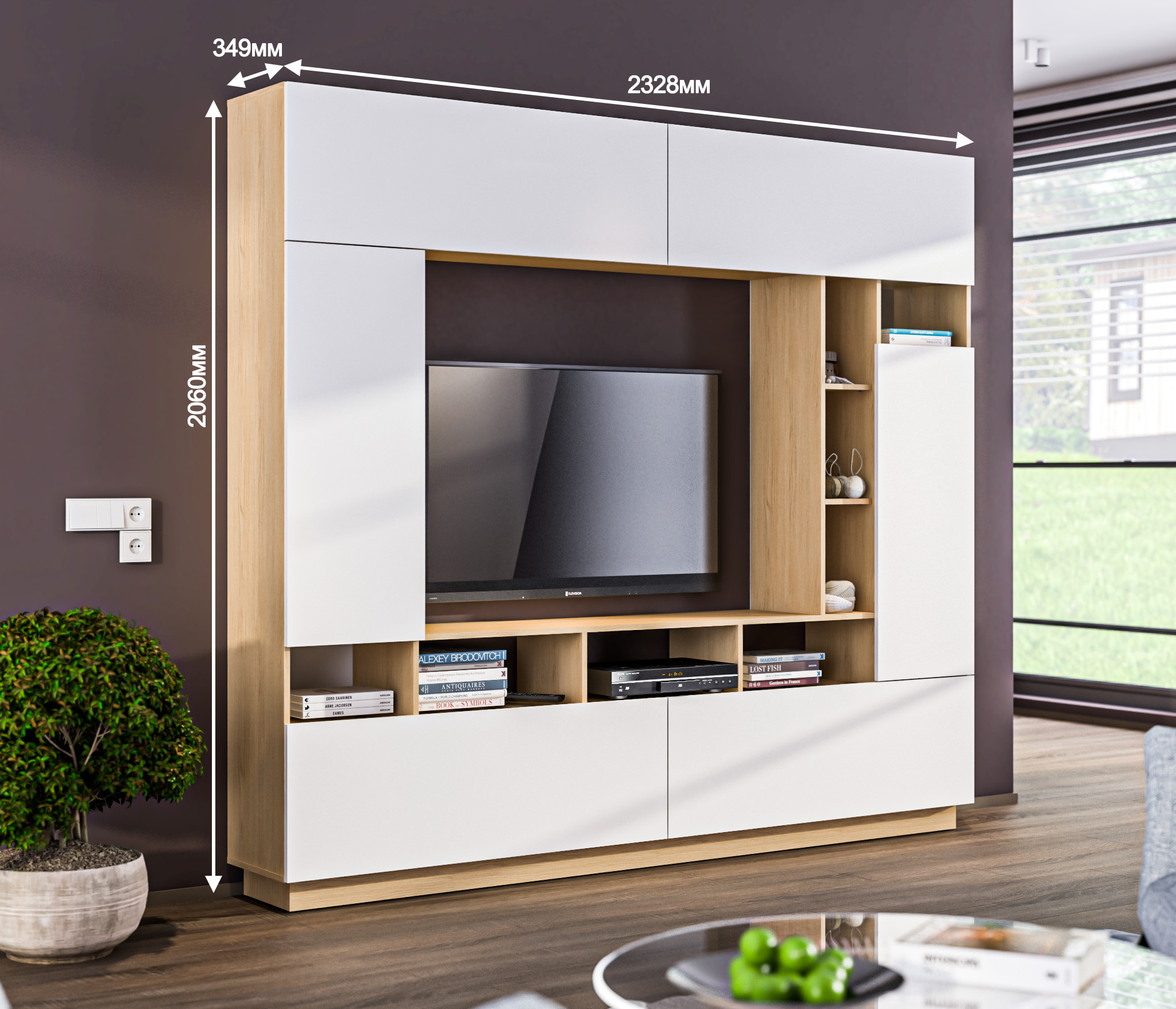 Стенка Нео СБ-2898 – практичный и стильный предмет мебели, который станет идеальным дополнением интерьера гостиной. Органично смотрится соло. Габаритные размеры – ширина 232 см, высота 206 см, глубина 34 см. В состав стенки входит: тумба под телевизор с открытыми полками для видео, аудио аппаратуры и отделениями с непрозрачными дверцами, открытая витрина для демонстрации коллекции декоративной посуды или памятных сувениров, шкафы для книг, посуды. Корпус стенки выполнен из КДСП, фасады - из МДФ в актуальном цветовом решении.