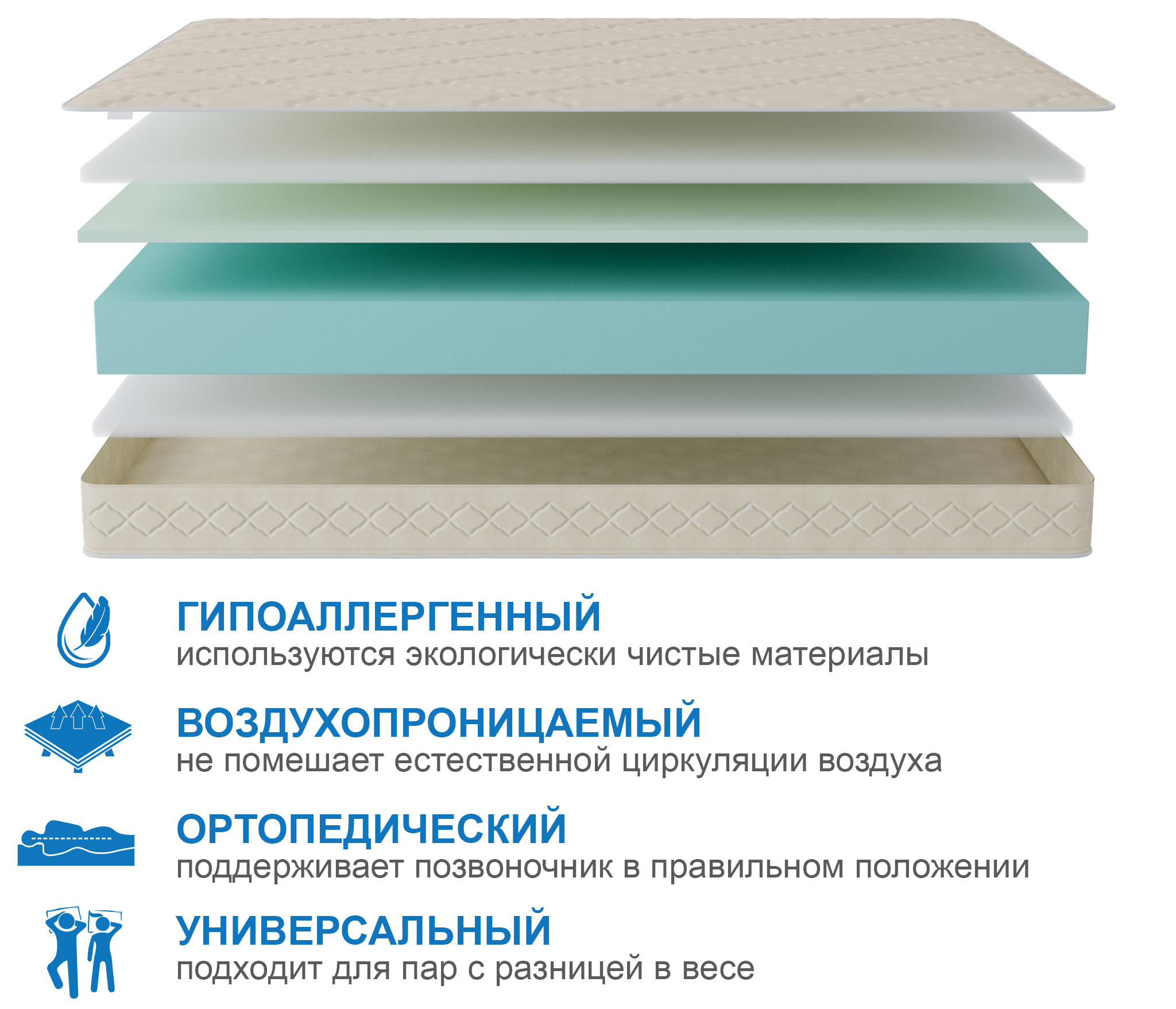 Беспружинный матрас отличается тем, что его структура позволяет точнее повторять контуры тела спящего, в отличие от пружинных матрасов, в которых точность подстройки ограничена диаметром пружины. В данном матрасе используется два вида современной пены, одна из них обладает средней жесткостью и принимает на себя все нагрузки, вторая пена обладает большей плотностью, но при этом она мягче, что придает одной сторон уникальные свойства, обусловленные сочетанием этих пен. Матрас очень легкий и подойдет для кроватей с подъемным механизмом, а также отлично ляжет в кровати с не высокими бортами. Может использоваться в детских или молодежных кроватях. Обращаем ваше внимание, что матрас и наматрасник отвечают за правильное положение позвоночника во время сна, но за шейный отдел позвоночника отвечает подушка, а не матрас, поэтому крайне важно не только правильно подобрать матрас, но и подушку, чтобы сон стал максимально комфортным и полезным. Рекомендовано использование вместе с защитным чехлом Aquastop. |