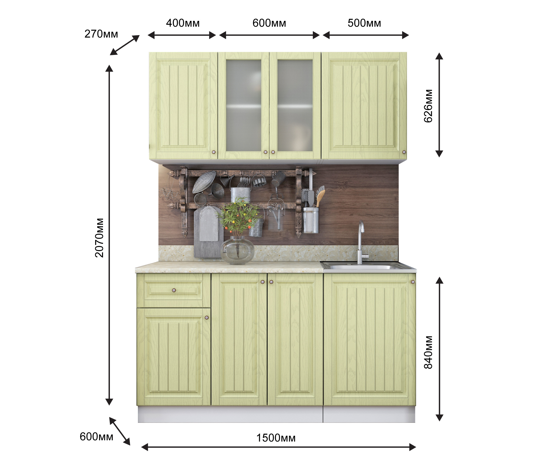 два верхних шкафа - общая ширина 1000мм (400-глухой , 600-со стеклом) и на 500мм. Высота 626мм. Глубина 270 мм.