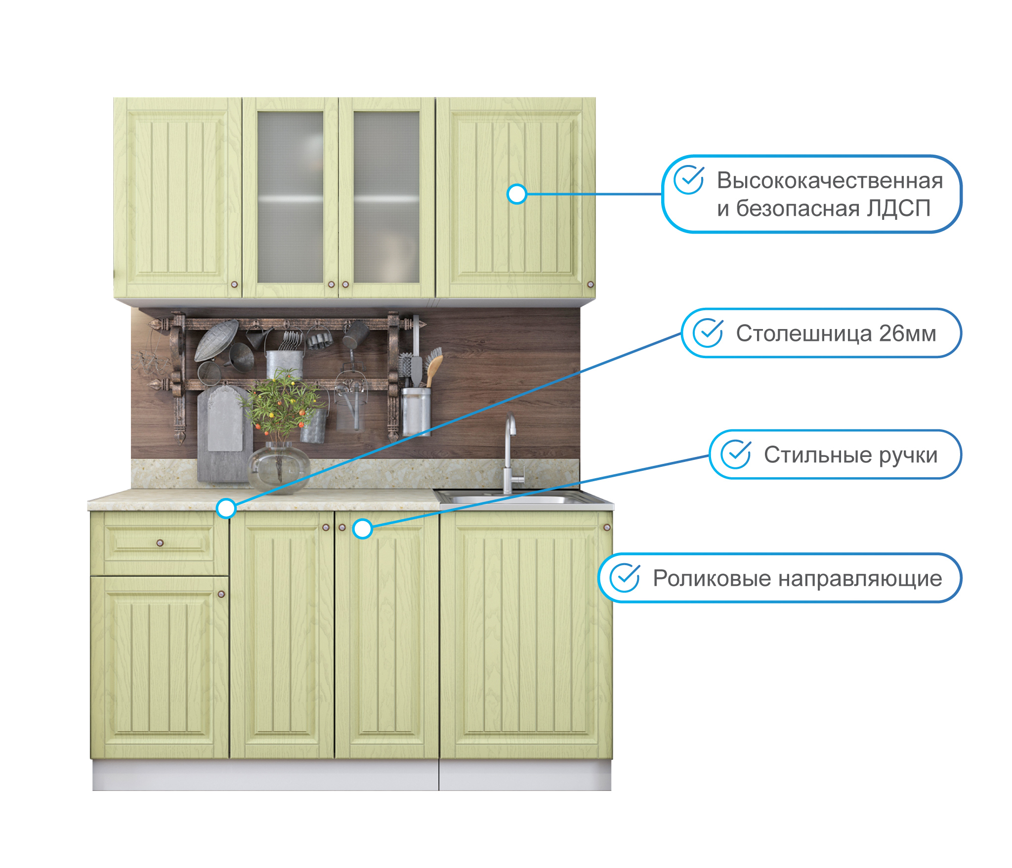 Я от этой кухни в восторге. Очень удобная, фасады крашеные, не клеенка, круглые ручки с рисунком. Для маленькой кухни это просто находка за такие деньги. Производителю большое спасибо.