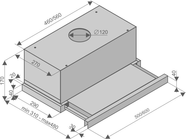 Особенности: Вытяжка снабжена двумя плоскими итальянскими моторами, которую обеспечивают высокую производительность. Выдвижна панель имеет такой же размер, что и основная стационарная панель, в результате чего покрывает всю рабочую зону. Широкий выбор цветовых исполнений.