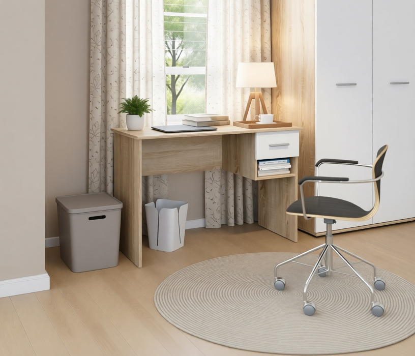 Письменный стол Мамбо СБ-2370 – комфортное рабочее место, где можно разместить ноутбук или любое периферийное оборудование. Идеален для детской комнаты или комнаты подростка. Его можно дополнить элементами из модульной коллекции Мамбо. Габаритные размеры – ширина 103 см, высота 71 см, глубина 50 см. Под столешницей размещен вместительный выдвижной ящик, под ящиком – открытая полка. Модель производится из прочного КДСП. Корпус в цвете «Дуб Сонома». Текстура отделки практически не отличается от природного дерева. Фасады оформлены в белом цвете.