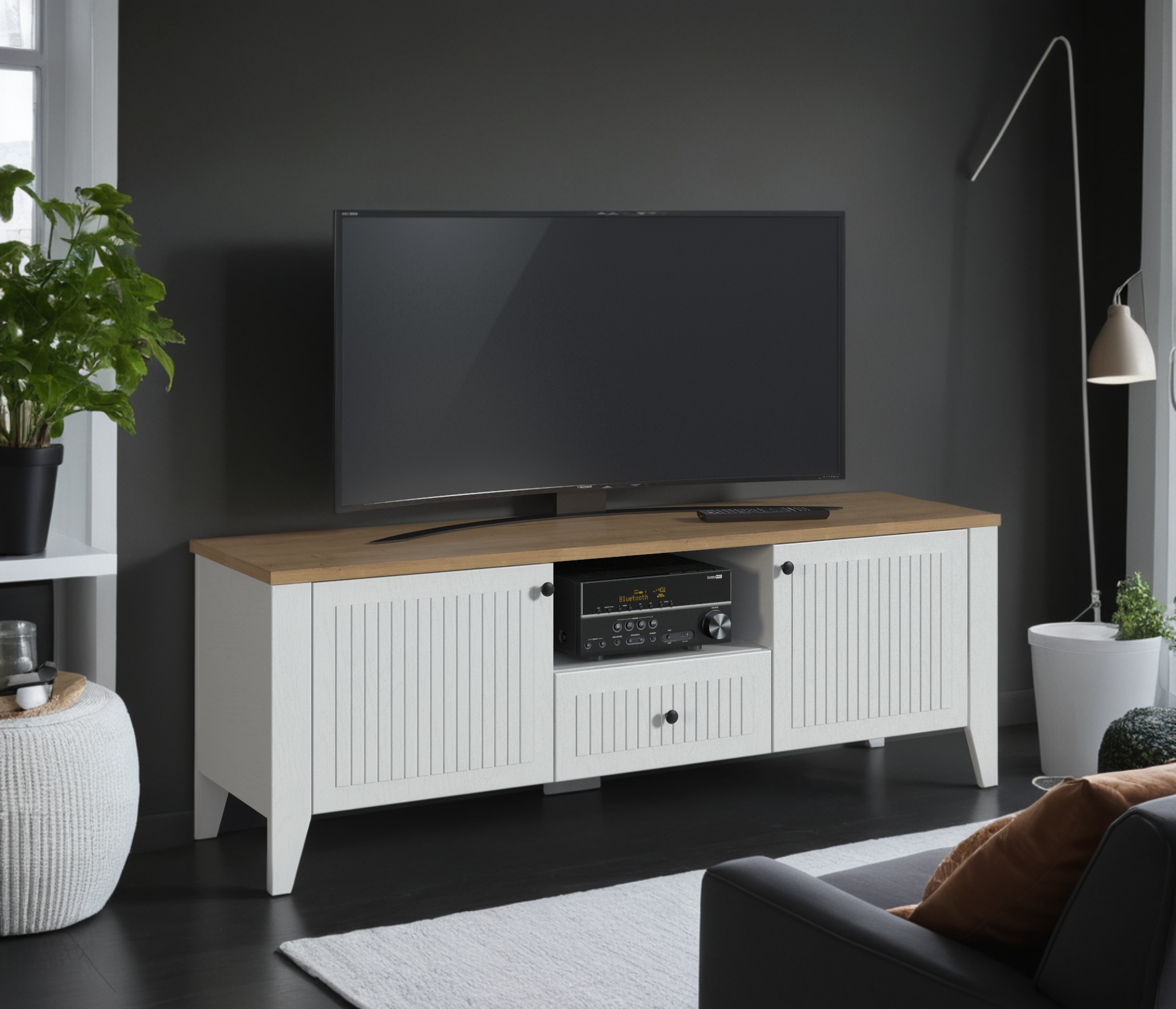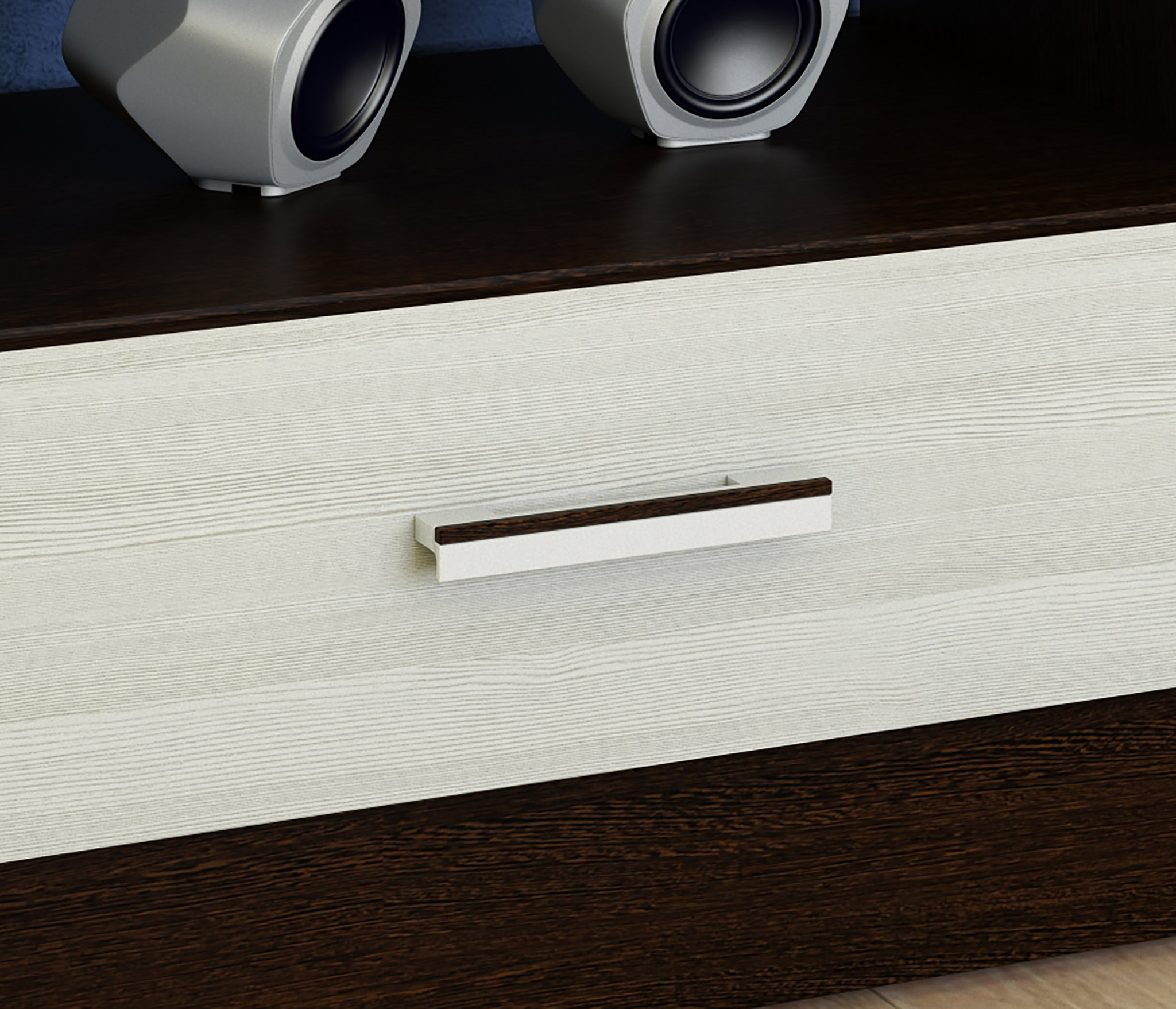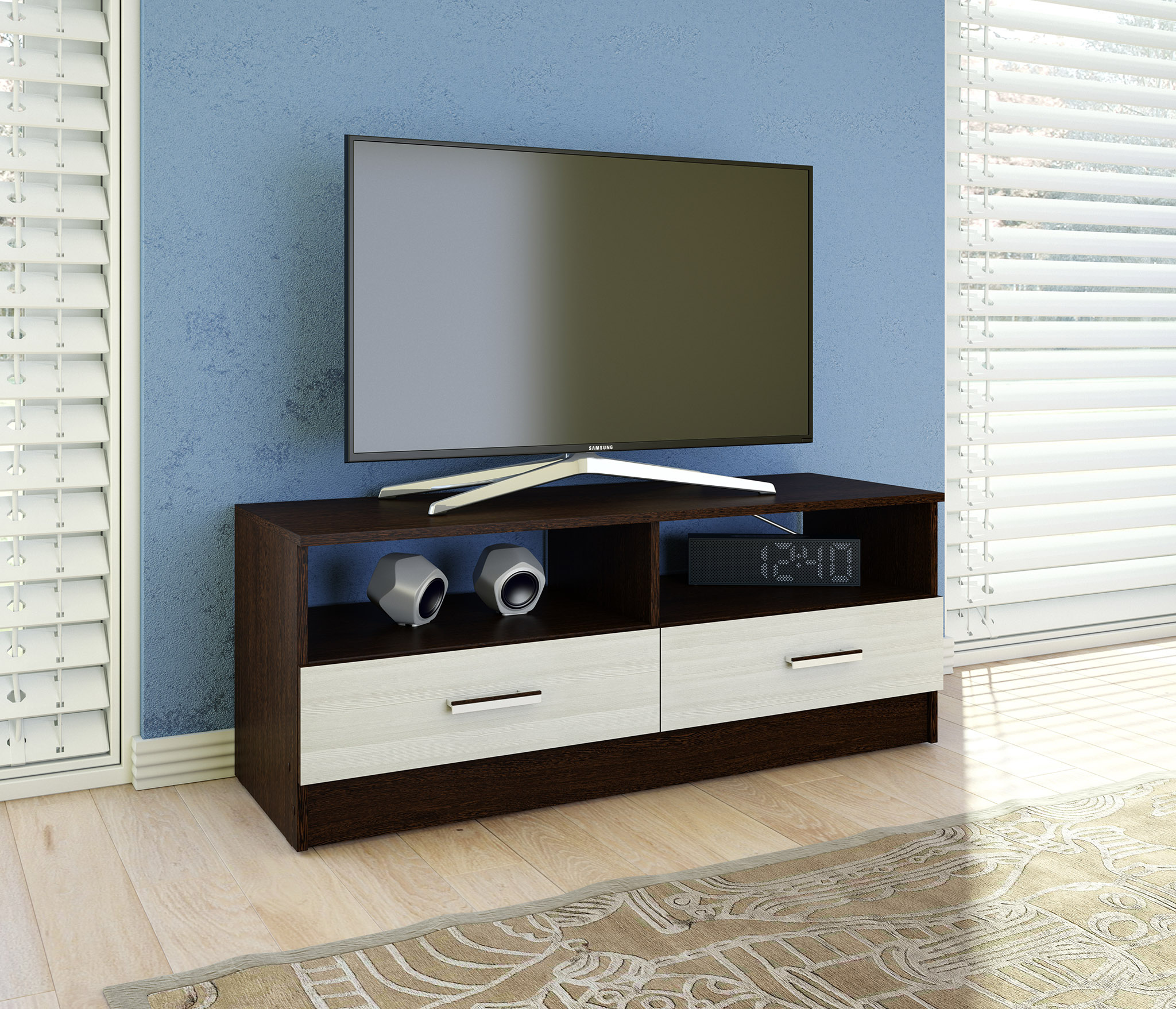 Простая, но практичная ТВ-тумба прекрасно подойдет для обустройства современного интерьера. Широкие полки и ящики позволят с удобством разместить технику и сопутствующие аксессуары.