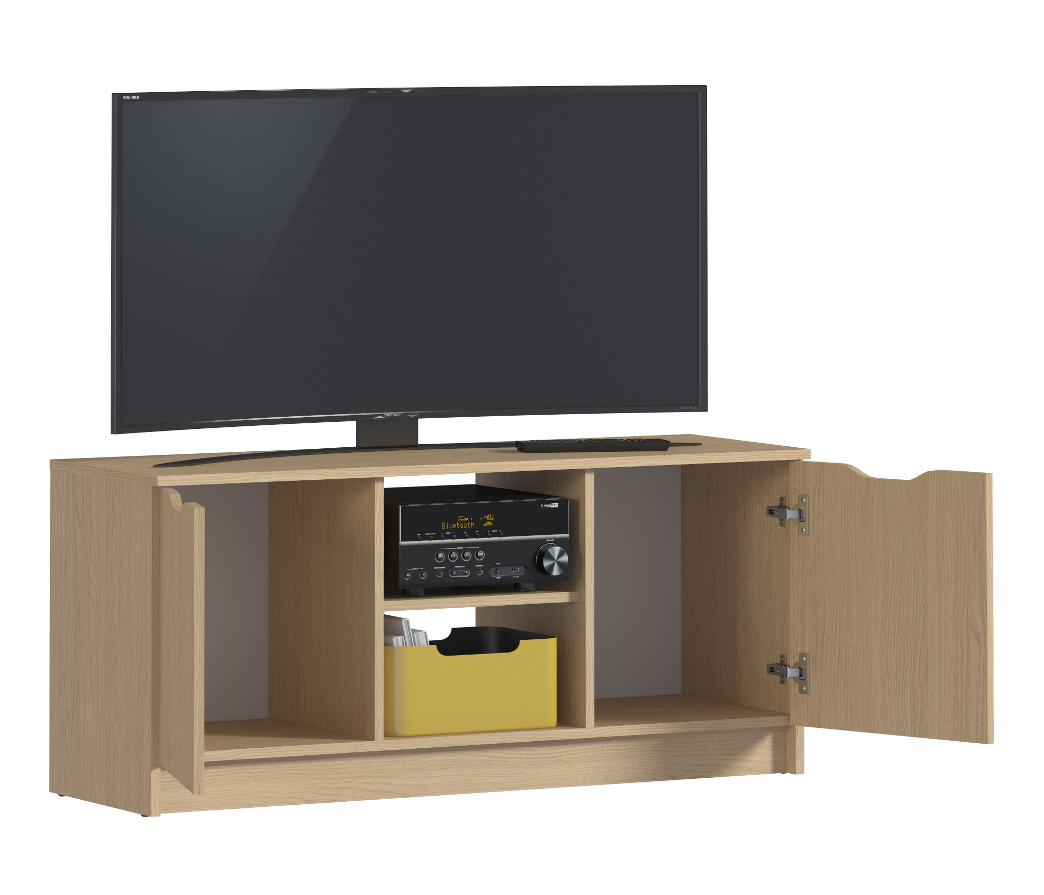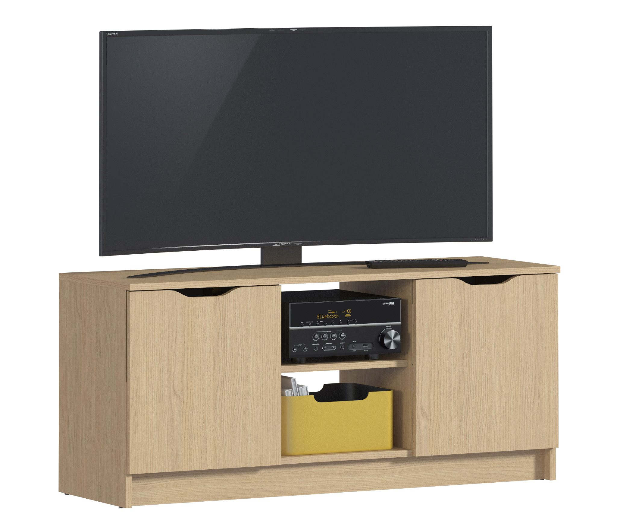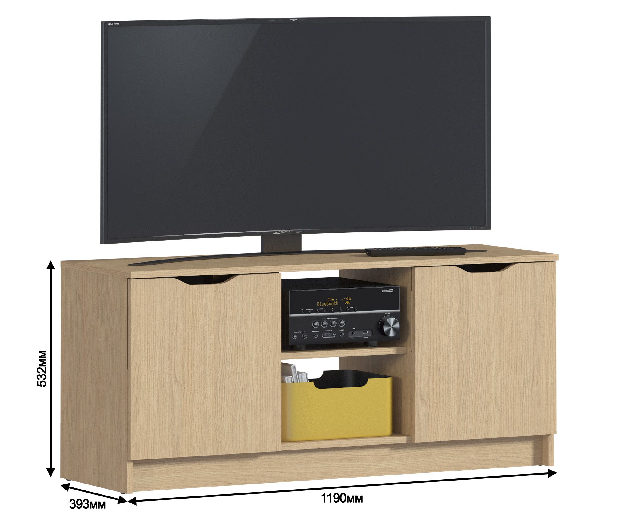 Габаритные размеры – ширина 119, высота 53 см и глубина 39 см. Вес тумбы 24,42 кг, что даёт возможность передвигать её по усмотрению. Визуально тумбу можно разделить на три отделения – открытое центральное с двумя полками для аудио или видео системы и два вместительных отделения с дверцами. Тумба выполнена в минималистичном дизайне из прочного современного материала ЛДСП.