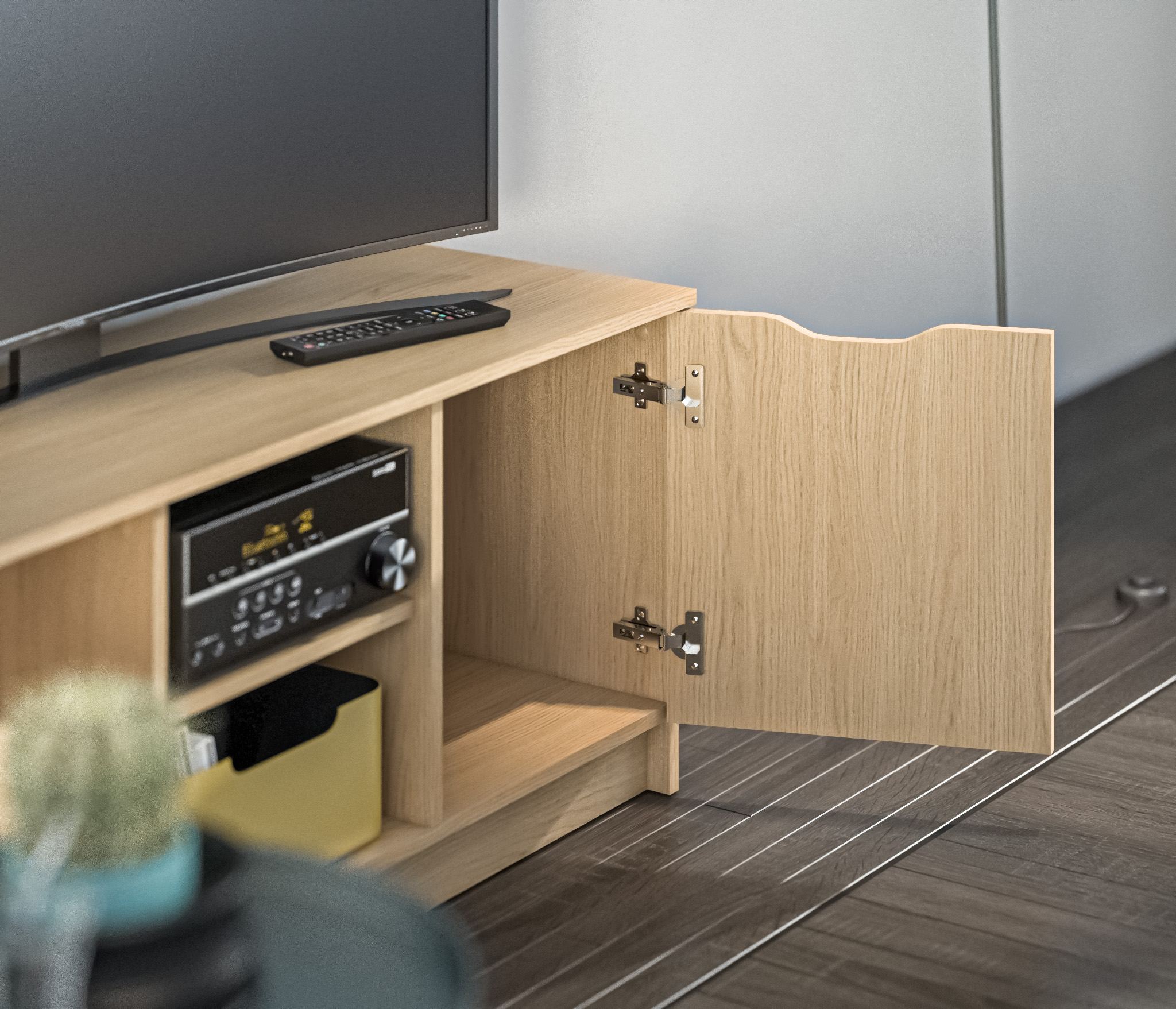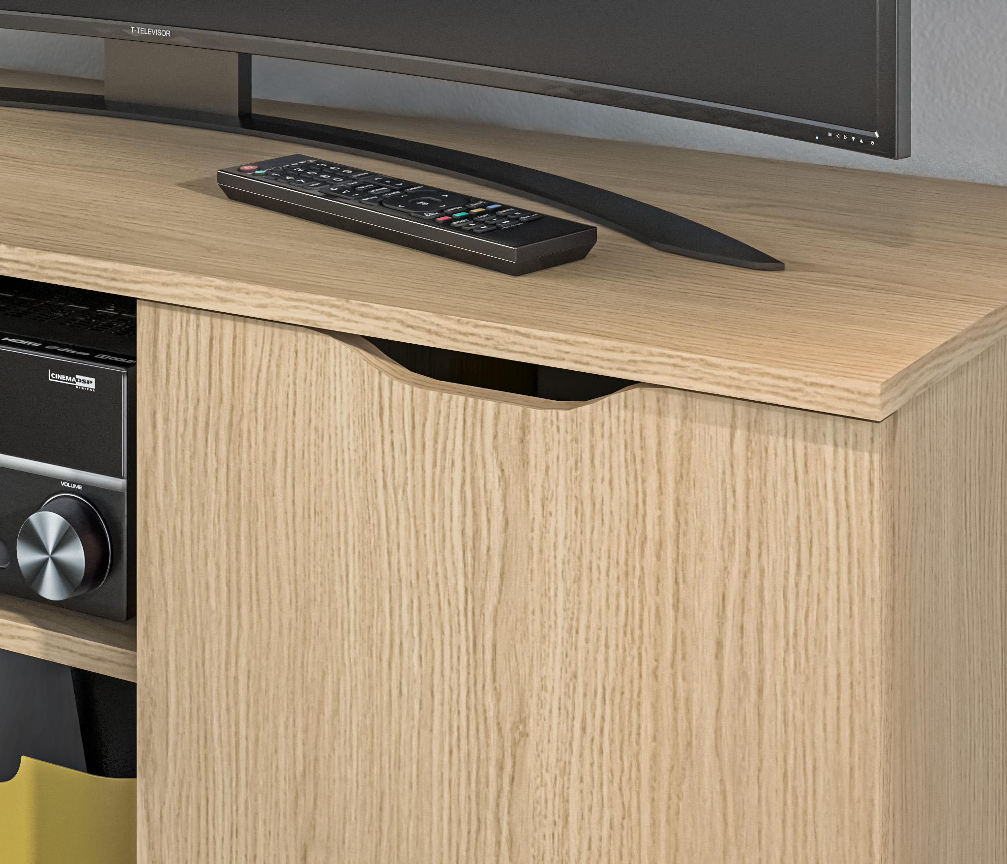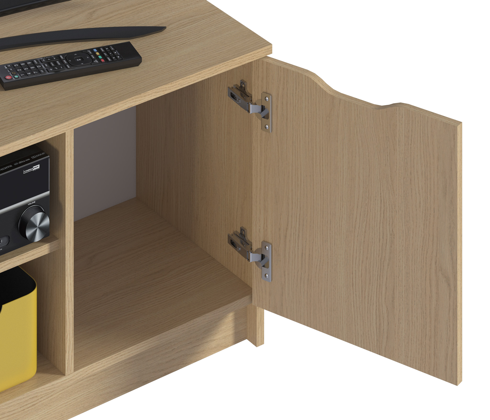 Габаритные размеры – ширина 119, высота 53 см и глубина 39 см. Вес тумбы 24,42 кг, что даёт возможность передвигать её по усмотрению. Визуально тумбу можно разделить на три отделения – открытое центральное с двумя полками для аудио или видео системы и два вместительных отделения с дверцами. Тумба выполнена в минималистичном дизайне из прочного современного материала ЛДСП.