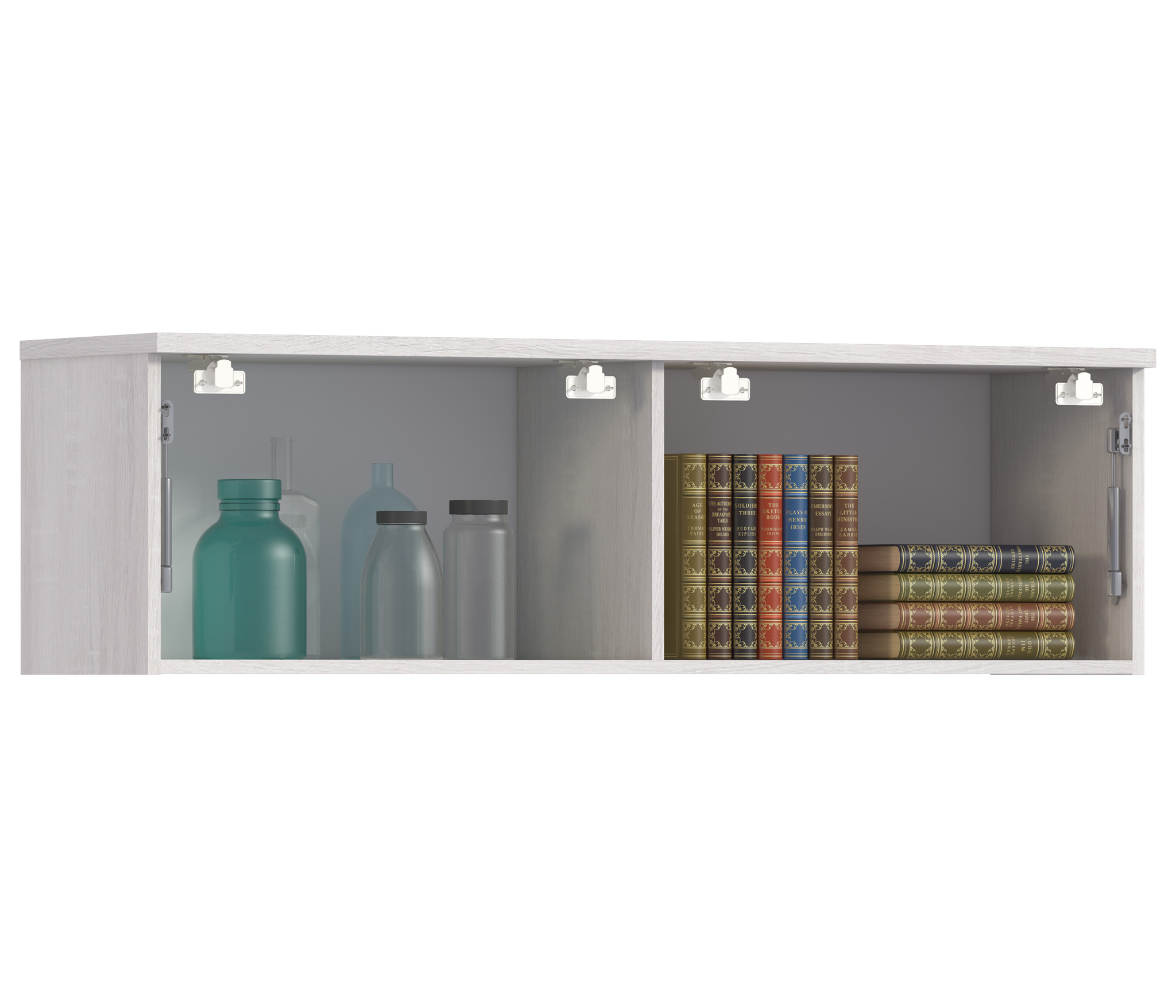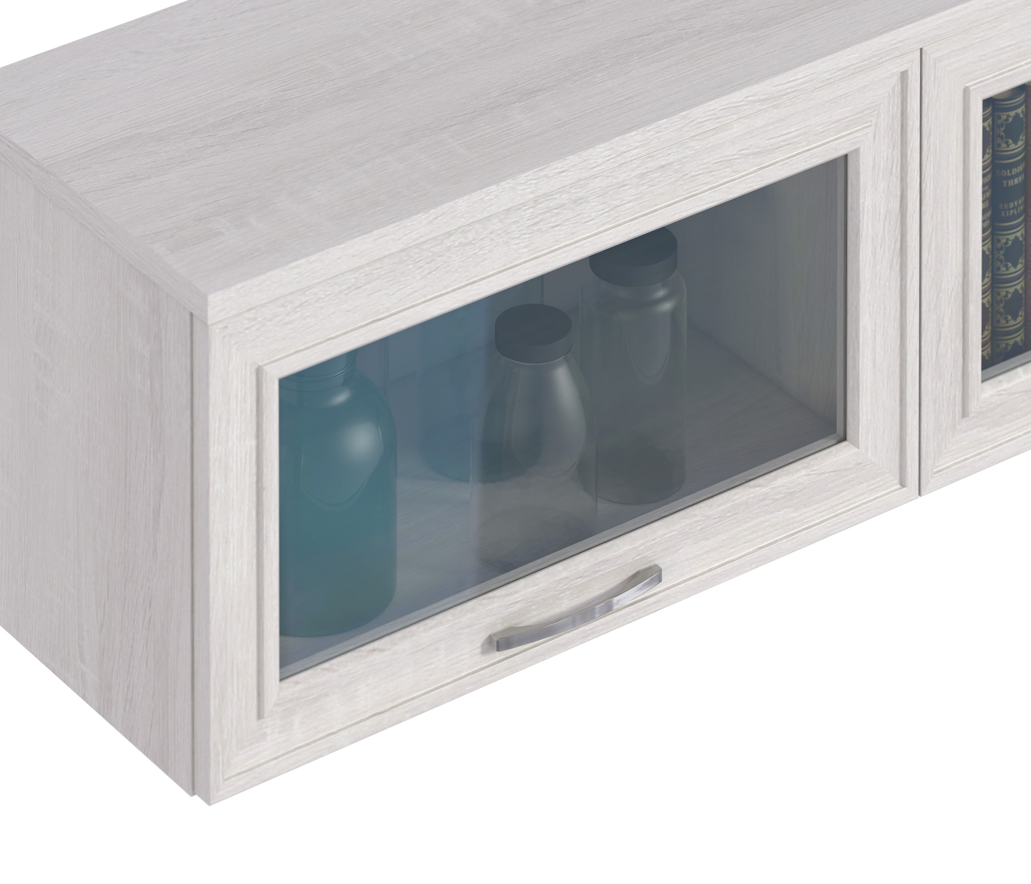 Габаритные размеры – ширина 132 см, высота 38 см и глубина 35 см. Полка имеет два вместительных отделения, каждое с остеклённой дверцей. Произведена полка из современных материалов - КДСП и МДФ.Классическое исполнение, светлый оттенок оформления «Дуб Сонома белый», подобранная фурнитура и качественные механизмы говорят о достойном качестве навесной полки Флоренция СБ-2403. Полка крепится к стене при помощи дюбелей, которые входят в комплект.