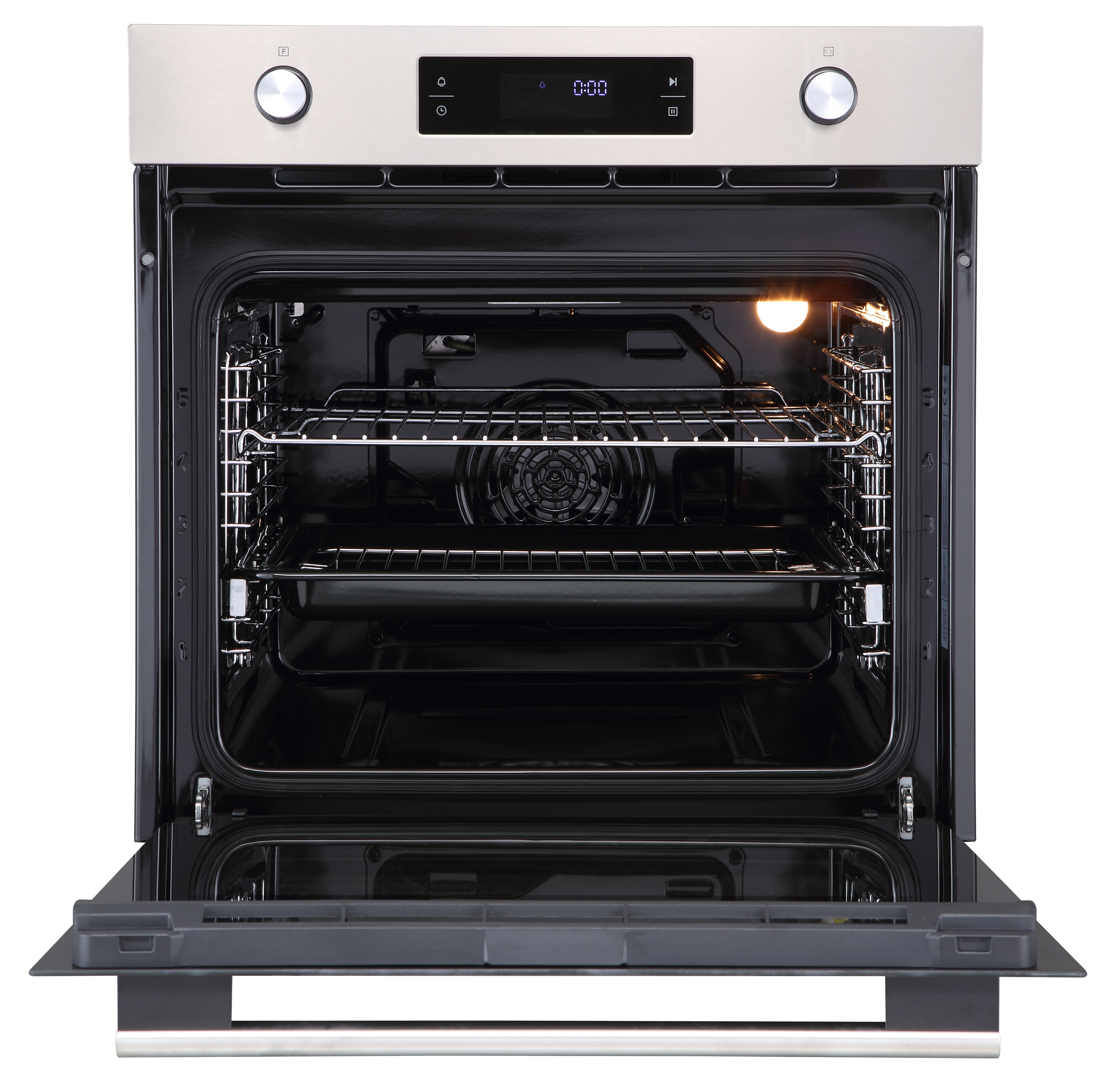 Электрический духовой шкаф встраиваемый полноразмерный, 60 см, 9 режимов, объем духовки 70л, утапливаемые переключатели, большой дисплей Snow White, хромированные боковые решетки, телескопические направляющие 1 уровень, панель управления - нержавеющая сталь, универсальный противень, решетка-гриль, тройное стекло дверцы, легко-съемное большое внутреннее стекло Full Glass, защитное отключение, охлаждающий вентилятор, электронный таймер 9 часов, 595х575х595 мм.