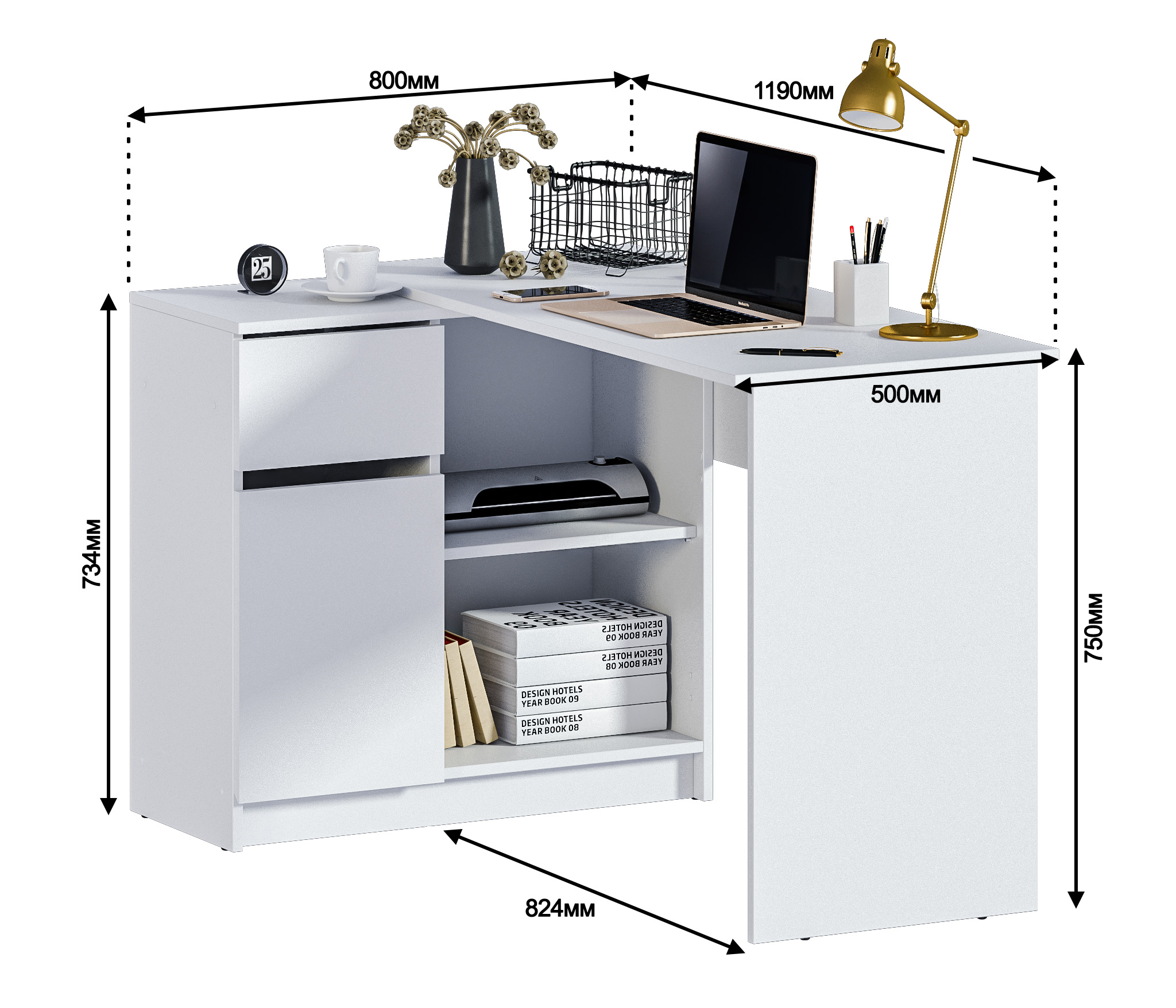 Габаритные размеры – ширина 119 см, высота 75 см и глубина 80 см. Под рабочей поверхностью расположена тумба с открытыми вместительными полками, а также выдвижной ящик и закрытое отделение с отдельной дверцей. Стол произведен из современного экологичного ЛДСП. Возможен как левый, так и правый вариант сборки.