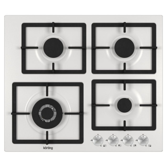 Газовая варочная панель 60 см, 4 высокоэффективные конфорки, WOK- сверхмощная конфорка с тройным рядом пламени, автоматический электроподжиг, газ-контроль каждой конфорки, передние металлические переключатели, утопленные чугунные решетки, в комплекте - чугунная подставка WOK.
