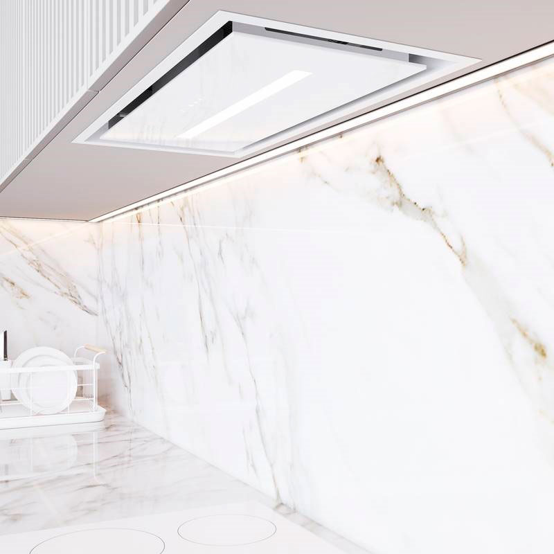 + Полностью встраиваемая вытяжка с т-образным корпусом. Стильное сочетание закаленного стекла и окрашенной стали. Декоративный люк из закаленного стекла скрывает пятислойный алюминиевый, жироулавливающий фильтр с усиленной конструкцией