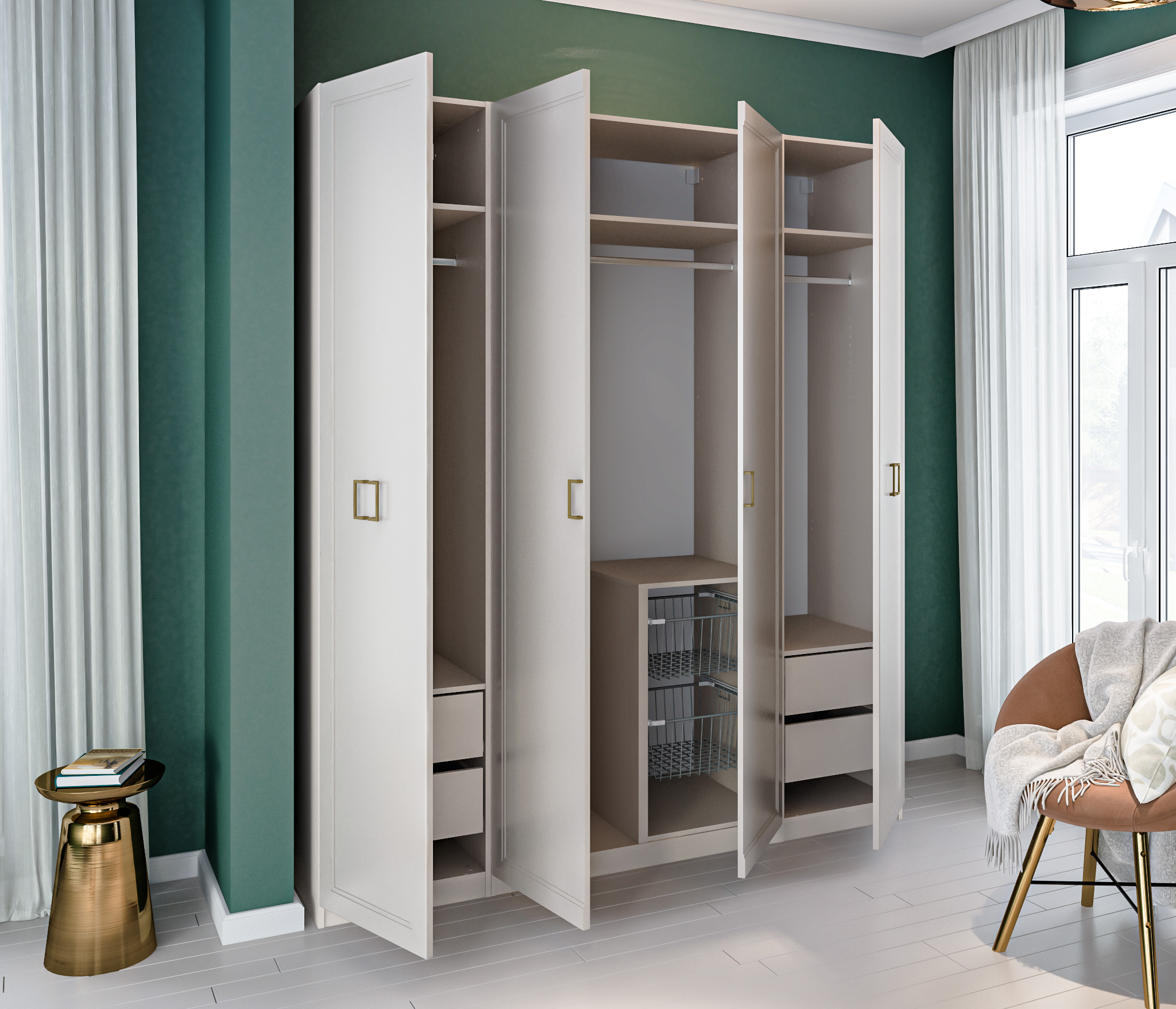 Золотистые ручки и ножки коллекции ""Ассоль"" добавляют неповторимый шик и изысканность, завершая образ тонким и стильным блеском. Эти акценты создают атмосферу роскоши и утонченности. Они играют роль визуального украшения, дополняя общий вид мебели и придавая ей особый шарм и элегантность.